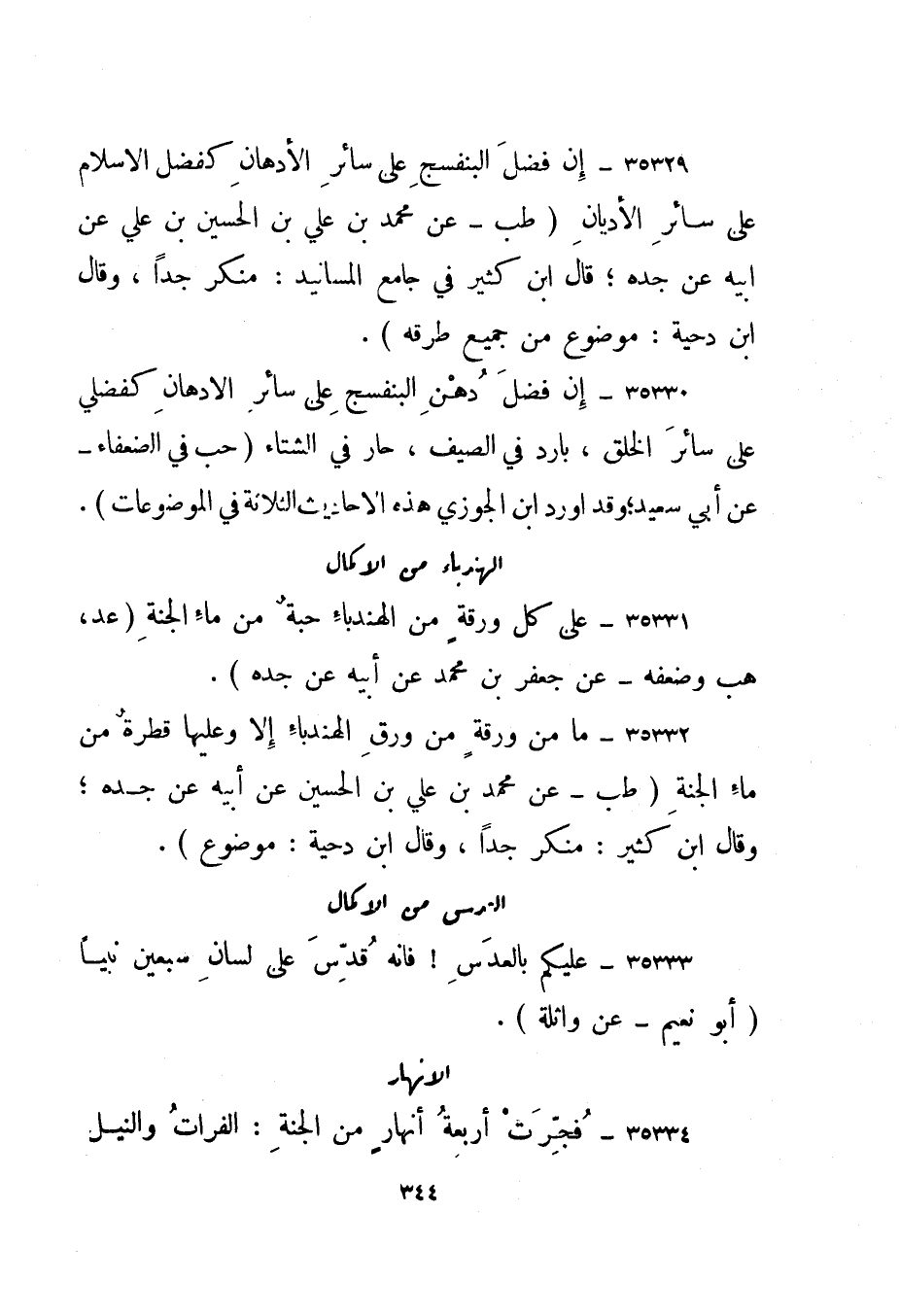 35330- " إن فضل دهن البنفسج على سائر الأدهان كفضلي على سائر الخلق، بارد في الصيف، حار في الشتاء. " حب في الضعفاء - عن أبي سعيد؛ وقد أورد ابن الجوزي هذه الأحاديث الثلاثة في الموضوعات".