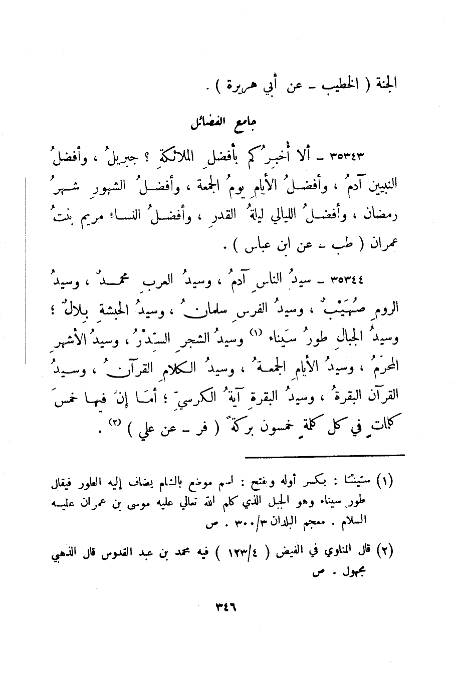 35344- " سيد الناس آدم، وسيد العرب محمد، وسيد الروم صهيب، وسيد الفرس سلمان، وسيد الحبشة بلال؛ وسيد الجبال طور سيناء 1 وسيد الشجر السدر، وسيد الأشهر المحرم، وسيد الأيام الجمعة، وسيد الكلام القرآن، وسيد القرآن البقرة، وسيد البقرة آية الكرسي؛ أما إن فيها خمس كلمات في كل كلمة خمسون بركة. " فر - عن علي"2.