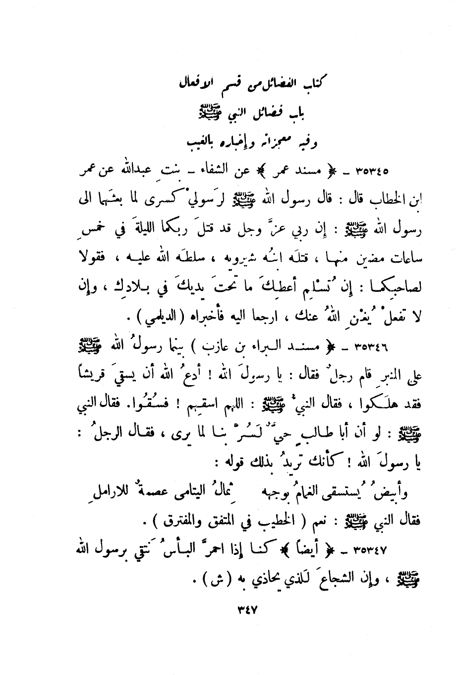 35345- "مسند عمر" عن الشفاء - بنت عبد الله عن عمر ابن الخطاب قال: قال رسول الله صلى الله عليه وسلم لرسولي كسرى لما بعثهما إلى رسول الله صلى الله عليه وسلم: إن ربي عز وجل قد قتل ربكما الليلة في خمس ساعات مضين منها، قتله ابنه شيرويه، سلطه الله عليه، فقولا لصاحبكما: إن تسلم أعطك ما تحت يديك في بلادك، وإن لا تفعل يغن الله عنك، ارجعا إليه فأخبراه. "الديلمي".