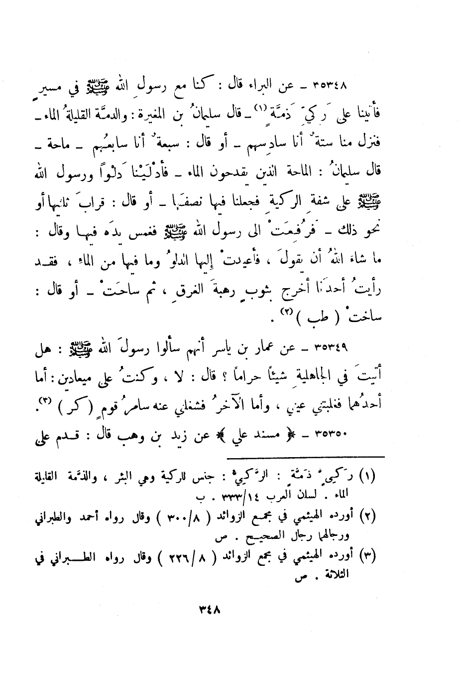 35348- عن البراء قال: كنا مع رسول الله صلى الله عليه وسلم في مسير فأتينا على ركي ذمة 1 - قال سليمان بن المغيرة: والدمة القليلة الماء - فنزل منا ستة أنا سادسهم - أو قال: سبعة أنا سابعهم - ماحة - قال سليمان: الماحة الذين يقدحون الماء - فأدلينا دلوا ورسول الله صلى الله عليه وسلم على شفة الركية فجعلنا فيها نصفها - أو قال: قراب ثلثيها أو نحو ذلك - فرفعت إلى رسول الله صلى الله عليه وسلم فغمس يده فيها وقال: ما شاء الله أن يقول، فأعيدت إليها الدلو وما فيها من الماء، فقد رأيت أحدنا أخرج بثوب رهبة الغرق، ثم ساحت - أو قال: ساخت. "طب"2.