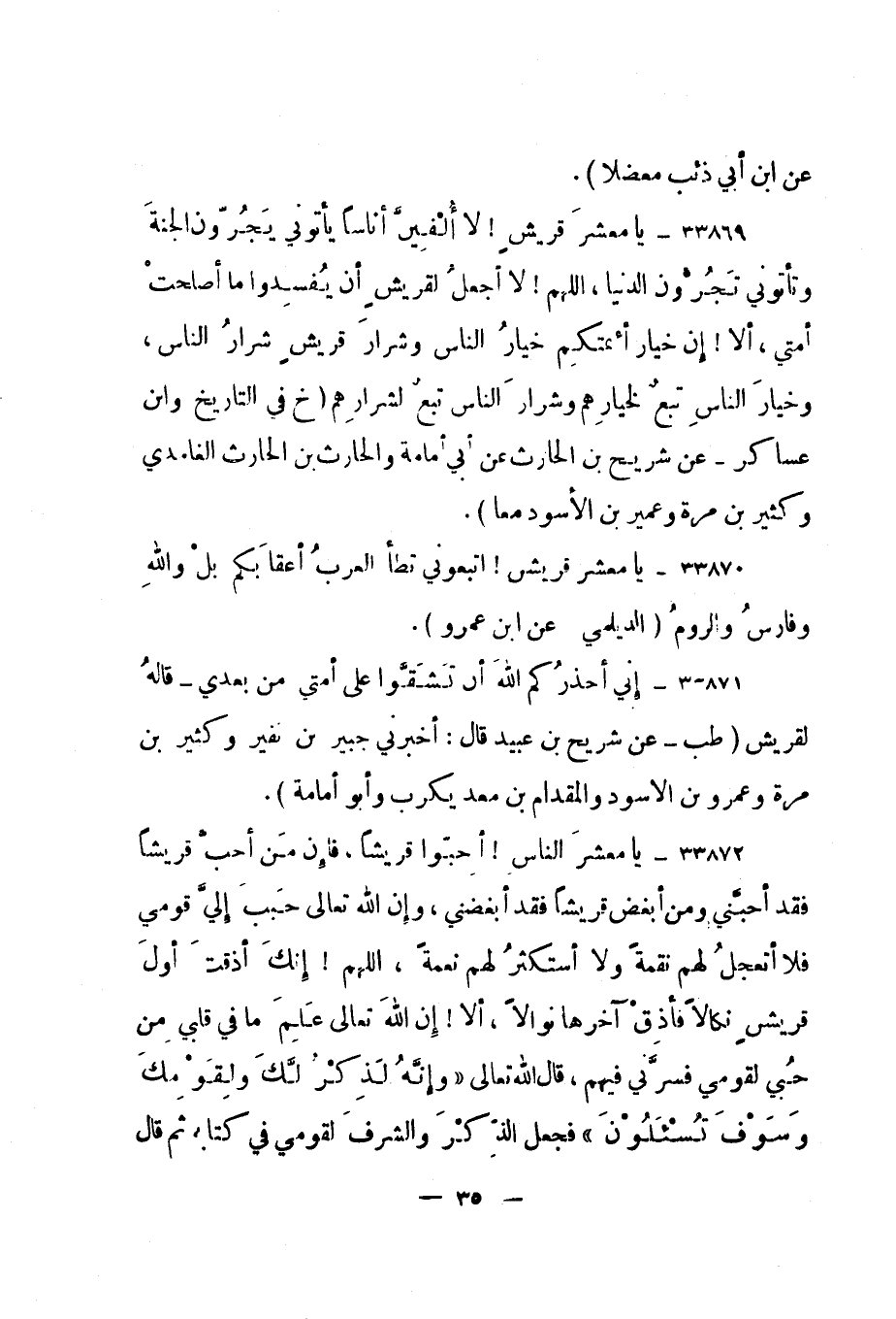 33870- "يا معشر قريش! اتبعوني تطأ العرب أعقابكم بل والله وفارس والروم. " الديلمي عن ابن عمرو".
