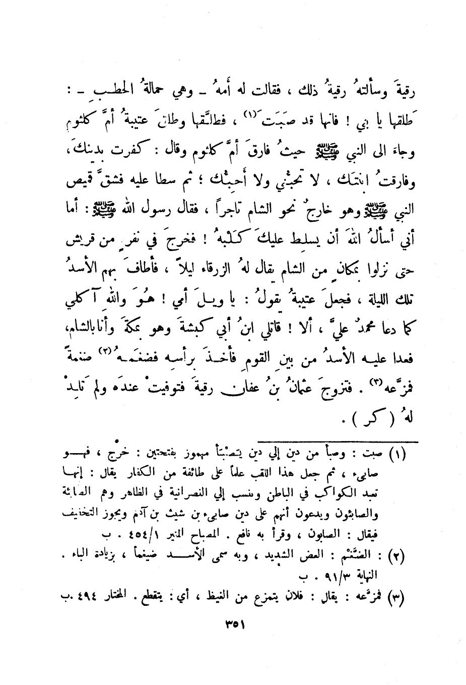 رقية وسألته رقية ذلك، فقالت له أمه - وهي حمالة الحطب -: طلقها يا بني! فإنها قد صبت 1، فطلقها وطلق عتيبة أم كلثوم وجاء إلى النبي صلى الله عليه وسلم حيث فارق أم كلثوم وقال: كفرت بدينك، وفارقت ابنتك، لا تحبني ولا أحبك؛ ثم سطا عليه فشق قميص النبي صلى الله عليه وسلم وهو خارج نحو الشام تاجرا، فقال رسول الله صلى الله عليه وسلم: " أما أني أسأل الله أن يسلط عليك كلبه"! فخرج في نفر من قريش حتى نزلوا بمكان من الشام يقال له الزرقاء ليلا، فأطاف بهم الأسد تلك الليلة، فجعل عتيبة يقول: يا ويل أمي! هو والله آكلي كما دعا محمد علي، ألا! قاتلي ابن أبي كبشة وهو بمكة وأنا بالشام، فعدا عليه الأسد من بين القوم فأخذ برأسه فضغمه 2 ضغمة فمزعه 3. فتزوج عثمان بن عفان رقية فتوفيت عنده ولم تلد له. "كر".