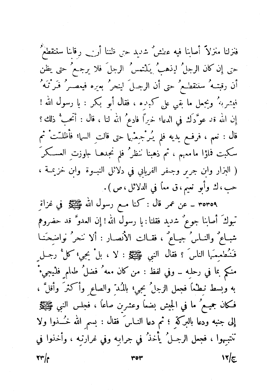 35359- عن عمر قال: كنا مع رسول الله صلى الله عليه وسلم في غزاة تبوك أصابنا جوع شديد فقلنا: يا رسول الله! إن العدو قد حضروهم شباع والناس جياع، فقالت الأنصار: ألا ننحر نواضحنا فنطعمها الناس؟ فقال النبي صلى الله عليه وسلم: "لا، بل يجيء كل رجل منكم بما في رحله" - وفي لفظ: من كان معه فضل طعام فليجيء به وبسط نطعما فجعل الرجل يجيء بالمد والصاع وأكثر وأقل، فكان جميع ما في الجيش بضعا وعشرين صاعا، فجلس النبي صلى الله عليه وسلم إلى جنبه ودعا بالبركة؛ ثم دعا الناس فقال: "بسم الله خذوا ولا تنتبهوا"، فجعل الرجل يأخذ في جرابه وفي غرارته، وأخذوا في