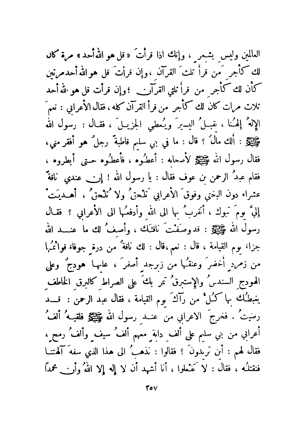 العالمين وليس بشعر، وإنك إذا قرأت {قُلْ هُوَ اللَّهُ أَحَدٌ} مرة كان لك كأجر من قرأ ثلث القرآن، وإن قرأت: {قُلْ هُوَ اللَّهُ أَحَدٌ} مرتين كان لك كأجر من قرأ ثلثي القرآن؛ وإن قرأت: {قُلْ هُوَ اللَّهُ أَحَدٌ} ثلاث مرات كان كان لك كأجر من قرأ القرآن كله، فقال الأعرابي: نعم الإله إلهنا، يقبل اليسير ويعطي الجزيل، فقال: رسول الله صلى الله عليه وسلم: ألك مال؟ قال: ما في بني سليم قاطبة رجل هو أفقر مني، فقال رسول الله صلى الله عليه وسلم لأصحابه: أعطوه، فأعطوه حتى أبطروه، فقام عبد الرحمن بن عوف فقال: يا رسول الله! إن عندي ناقة عشراء دون البختي وفوق الأعرابي تلحق ولا تلحق، أهديت إلي يوم تبوك، أتقرب بها إلى الله وأدفعها إلى الأعرابي؟ فقال رسول الله صلى الله عليه وسلم: قد وصفت ناقتك، وأصف لك ما عند الله جزاء يوم القيامة، قال: نعم، قال: لك ناقة من درة جوفاء قوائمها من زمرد أخضر وعنقها من زبرجد أصفر، عليها هودج وعلى الهودج السندس والإستبرق تمر بك على الصراط كالبرق الخاطف يغبطك بها كل من رآك يوم القيامة، فقال عبد الرحمن: قد رضيت. فخرج الأعرابي من عند رسول الله صلى الله عليه وسلم فلقيه ألف أعرابي من بني سليم على ألف دابة معهم ألف سيف وألف رمح، فقال لهم: أين تريدون؟ فقالوا: نذهب إلى هذا الذي سفه آلهتنا فنقتله، فقال: لا تفعلوا، أنا أشهد أن لا إله إلا الله وأن محمدا