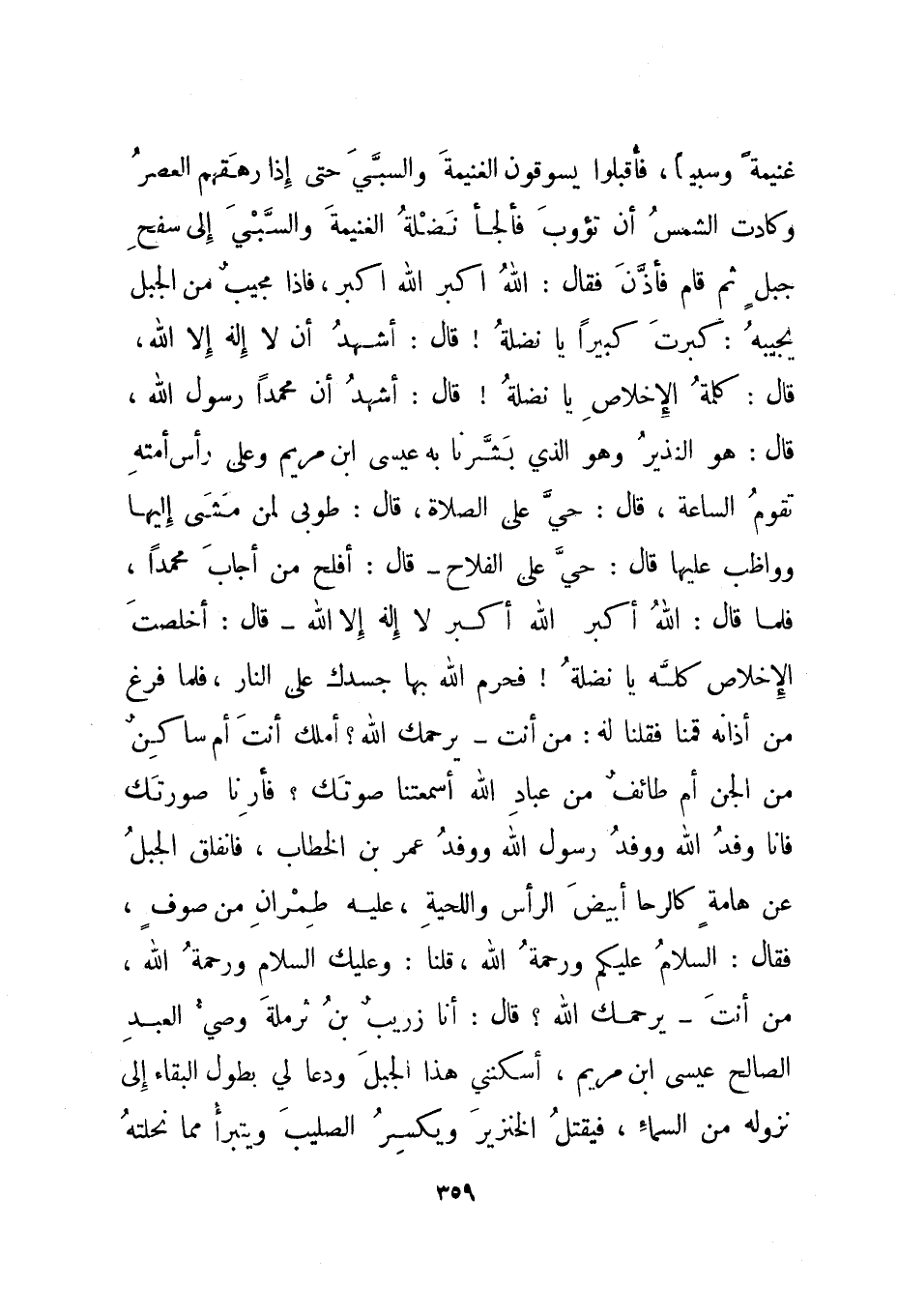 غنيمة وسبيا، فأقبلوا يسوقون الغنيمة والسبي حتى إذا رهقهم العصر وكادت الشمس أن تؤوب فألجأ نضلة الغنيمة والسبي إلى سفح جبل ثم قام فأذن فقال: الله أكبر الله أكبر، فإذا مجيب من الجبل يجيبه: كبرت كبيرا يا نضلة! قال: أشهد أن لا إله إلا الله، قال: كلمة الإخلاص يا نضلة! قال: أشهد أن محمدا رسول الله، قال: هو النذير وهو الذي بشرنا به عيسى ابن مريم وعلى رأس أمته تقوم الساعة، قال: حي على الصلاة، قال: طوبى لمن مشى إليها وواظب عليها قال: حي على الفلاح - قال: أفلح من أجاب محمدا، فلما قال: الله أكبر الله أكبر لا إله إلا الله - قال: أخلصت الإخلاص كله يا نضلة! فحرم الله بها جسدك على النار، فلما فرغ من أذانه قمنا فقلنا له: من أنت - يرحمك الله؟ أملك أنت أم ساكن من الجن أم طائف من عباد الله أسمعتنا صوتك؟ فأرنا صورتك فأنا وفد الله ووفد رسول الله ووفد عمر بن الخطاب، فانفلق الجبل عن هامة كالرحا أبيض الرأس واللحية، عليه طمران من صوف، فقال: السلام عليكم ورحمة الله، قلنا: وعليك السلام ورحمة الله، من أنت - يرحمك الله؟ قال: أنا زريب بن ثرملة وصي العبد الصالح عيسى ابن مريم، أسكنني هذا الجبل ودعا لي بطول البقاء إلى نزوله من السماء، فيقتل الخنزير ويكسر الصليب ويتبرأ مما نحلته