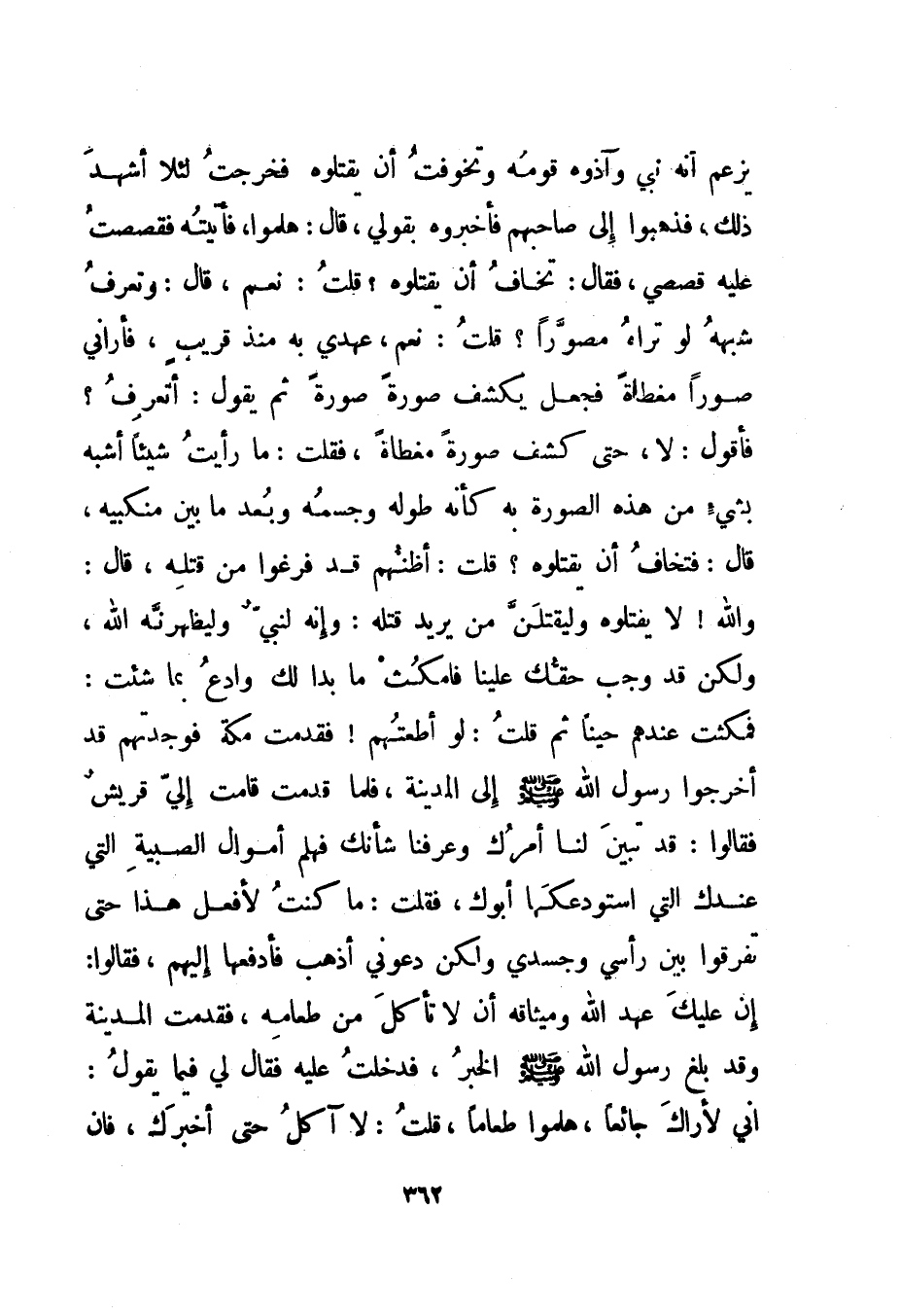 يزعم أنه نبي وآذوه قومه وتخوفت أن يقتلوه فخرجت لئلا أشهد ذلك، فذهبوا إلى صاحبهم فأخبروه بقولي، قال: هلموا، فأتيته فقصصت عليه قصصي، فقال: تخاف أن يقتلوه؟ قلت: نعم، قال: وتعرف شبهه لو تراه مصورا؟ قلت: نعم، عهدي به منذ قريب، فأراني صورا مغطاة فجعل يكشف صورة صورة ثم يقول: أتعرف؟ فأقول: لا، حتى كشف صورة مغطاة، فقلت: ما رأيت شيئا أشبه بشيء من هذه الصورة به كأنه طوله وجسمه وبعد ما بين منكبيه، قال: فتخاف أن يقتلوه؟ قلت: أظنهم قد فرغوا من قتله، قال: والله! لا يقتلوه وليقتلن من يريد قتله: وإنه لنبي وليظهرنه الله، ولكن قد وجب حقك علينا فامكث ما بدا لك وادع بما شئت: فمكثت عندهم حينا ثم قلت: لو أطعتهم! فقدمت مكة فوجدتهم قد أخرجوا رسول الله صلى الله عليه وسلم إلى المدينة، فلما قدمت قامت إلي قريش فقالوا: قد تبين لنا أمرك وعرفنا شأنك فهلم أموال الصبية التي عندك التي استودعكها أبوك، فقلت: ما كنت لأفعل هذا حتى تفرقوا بين رأسي وجسدي ولكن دعوني أذهب فأدفعها إليهم، فقالوا: إن عليك عهد الله وميثاقه أن لا تأكل من طعامه، فقدمت المدينة وقد بلغ رسول الله صلى الله عليه وسلم الخبر، فدخلت عليه فقال لي فيما يقول: إني لأراك جائعا، هلموا طعاما، قلت: لا آكل حتى أخبرك، فإن