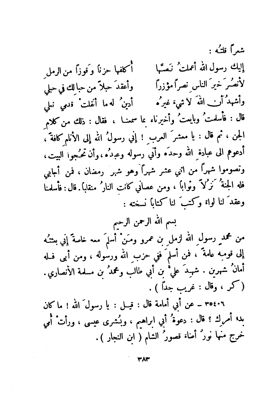 قال: فأسلمت وبايعت وأخبرناه بما سمعنا، فقال: ذلك من كلام الجن، ثم قال: يا معشر العرب! إني رسول الله إلى الأنام كافة، أدعوهم إلى عبادة الله وحده وأني رسوله وعبده، وأن تحجوا البيت، وتصوموا شهرا من اثني عشر شهرا وهو شهر رمضان، فمن أجابني فله الجنة نزلا وثوابا، ومن عصاني كانت النار منقلبا. قال: فأسلمنا وعقد لنا لواء وكتب لنا كتابا نسخته:
