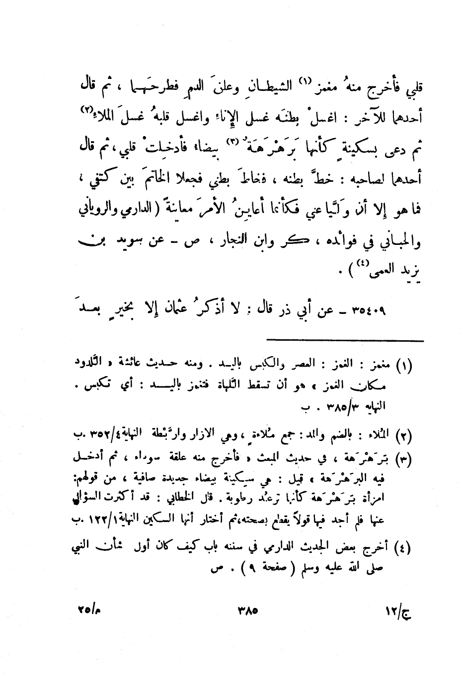 قلبي فأخرج منه مغمز 1 الشيطان وعلق الدم فطرحهما، ثم قال أحدهما للآخر: اغسل بطنه غسل الإناء واغسل قلبه غسل الملاء 2 ثم دعى بسكينة كأنها برهرهة 3 بيضاء فأدخلت قلبي، ثم قال أحدهما لصاحبه: خط بطنه، فخاط بطني فجعلا الخاتم بين كتفي، فما هو إلا أن وليا عني فكأنما أعاين الأمر معاينة. " الدارمي والروياني والحباني في فوائده، كر وابن النجار، ص - عن سويد بن يزيد العمى 4".