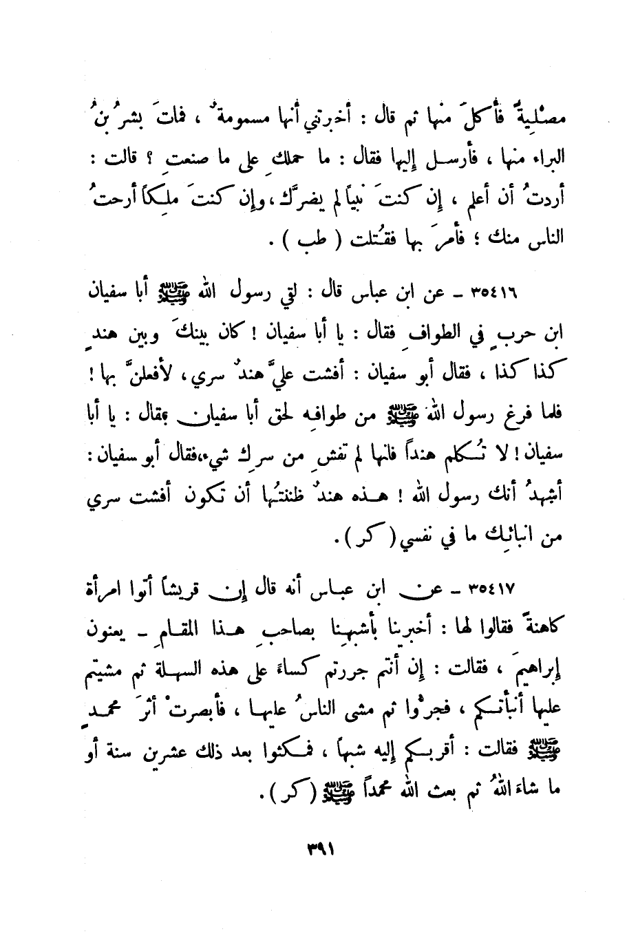 35416- عن ابن عباس قال: لقي رسول الله صلى الله عليه وسلم أبا سفيان ابن حرب في الطواف فقال: " يا أبا سفيان! كان بينك وبين هند كذا كذا "، فقال أبو سفيان: أفشت علي هند سري، لأفعلن بها! فلما فرغ رسول الله صلى الله عليه وسلم من طوافه لحق أبا سفيان فقال: " يا أبا سفيان! لا تكلم هندا فإنها لم تفش من سرك شيء"، فقال أبو سفيان: أشهد أنك رسول الله! هذه هند ظننتها أن تكون أفشت سري من انبائك ما في نفسي. "كر".