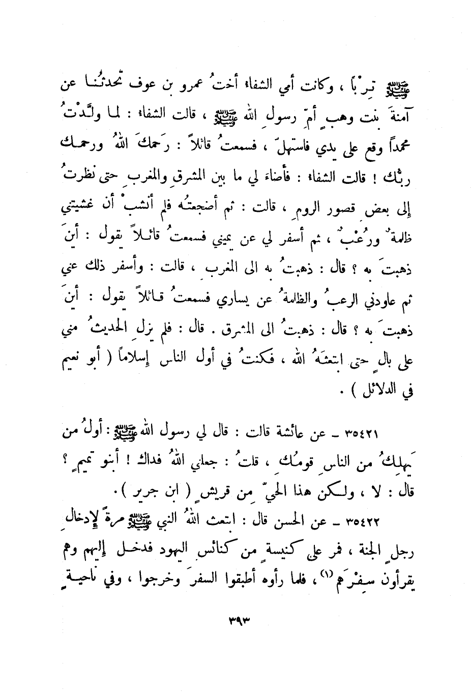 صلى الله عليه وسلم تربا، وكانت أمي الشفاء أخت عمرو بن عوف تحدثنا عن آمنة بنت وهب أم رسول الله صلى الله عليه وسلم، قالت الشفاء: لما ولدت محمدا وقع على يدي فاستهل، فسمعت قائلا: رحمك الله ورحمك ربك! قالت الشفاء: فأضاء لي ما بين المشرق والمغرب حتى نظرت إلى بعض قصور الروم، قالت: ثم أضجعته فلم أنشب أن غشيتني ظلمة ورعب، ثم أسفر لي عن يميني فسمعت قائلا يقول: أين ذهبت به؟ قال: ذهبت به إلى المغرب، قالت: وأسفر ذلك عني ثم عاودني الرعب والظلمة عن يساري فسمعت قائلا يقول: أين ذهبت به؟ قال: ذهبت إلى المشرق. قال: فلم يزل الحديث مني على بال حتى ابتعثه الله، فكنت في أول الناس إسلاما. "أبو نعيم في الدلائل".
