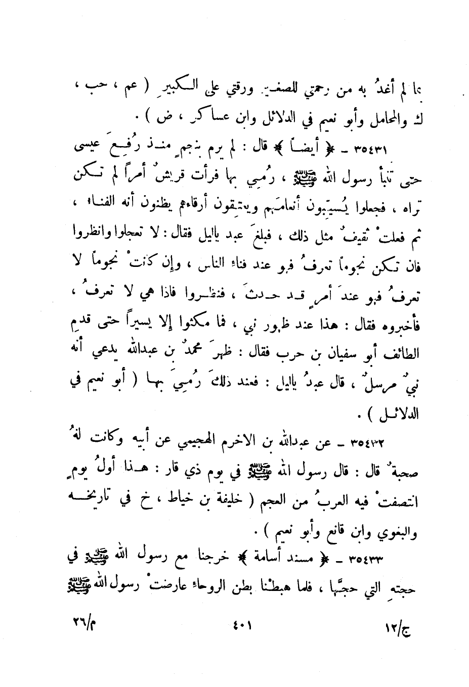 35431- "أيضاْ" قال: لم يرم بنجم منذ رفع عيسى حتى تنبأ رسول الله صلى الله عليه وسلم، رمي بها فرأت قريش أمرا لم تكن تراه، فجعلوا يسيبون أنعامهم ويعتقون أرقاءهم يظنون أنه الفناء، ثم فعلت ثقيف مثل ذلك، فبلغ عبد ياليل فقال: لا تعجلوا وانظروا فإن تكن نجوما تعرف فهو عند فناء الناس، وإن كانت نجوما لا تعرف فهو عند أمر قد حدث، فنظروا فإذا هي لا تعرف، فأخبروه فقال: هذا عند ظهور نبي، فما مكثوا إلا يسيرا حتى قدم الطائف أبو سفيان بن حرب فقال: ظهر محمد بن عبد الله يدعي أنه نبي مرسل، قال عبد ياليل: فعند ذلك رمي بها. "أبو نعيم في الدلائل".