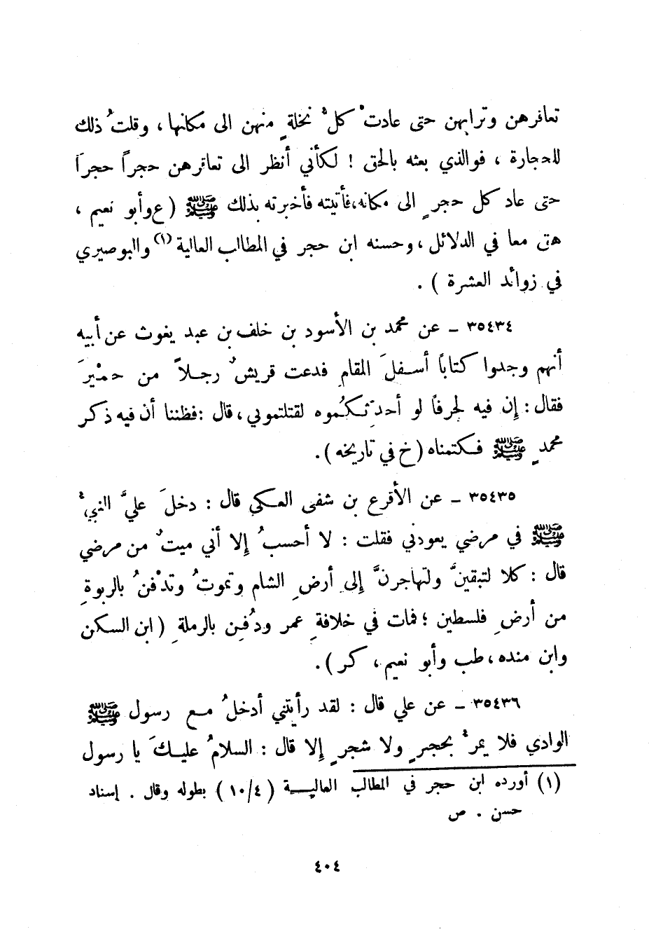 35436- عن علي قال: لقد رأيتني أدخل مع رسول الله صلى الله عليه وسلم الوادي فلا يمر بحجر ولا شجر إلا قال: السلام عليك يا رسول