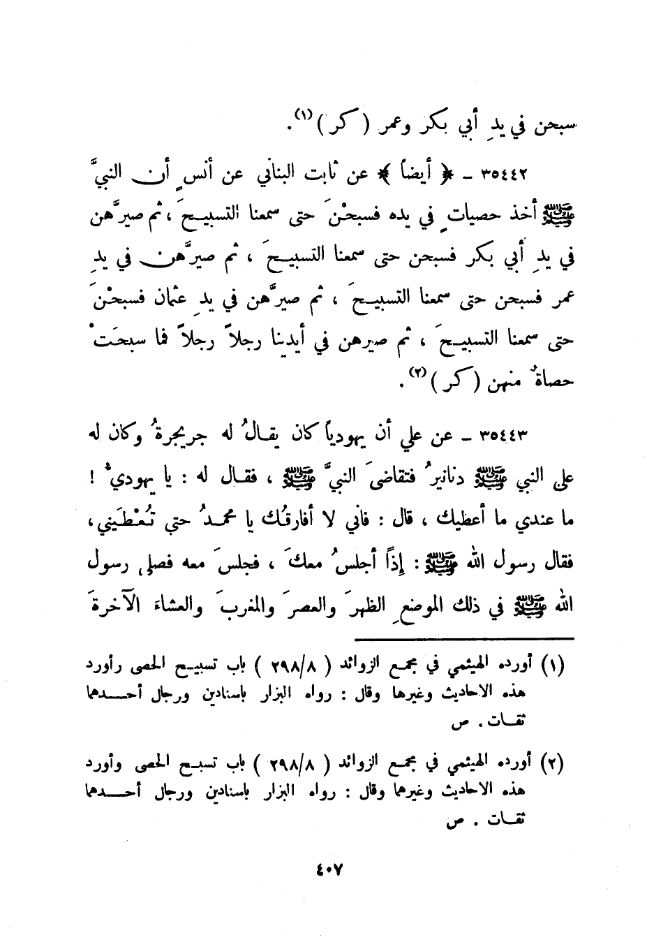 35442- "أيضا" عن ثابت البناني عن أنس أن النبي صلى الله عليه وسلم أخذ حصيات في يده فسبحن حتى سمعنا التسبيح، ثم صيرهن في يد أبي بكر فسبحن حتى سمعنا التسبيح، ثم صيرهن في يد عمر فسبحن حتى سمعنا التسبيح، ثم صيرهن في يد عثمان فسبحن حتى سمعنا التسبيح، ثم صيرهن في أيدينا رجلا رجلا فما سبحت حصاة منهن. "كر"2.