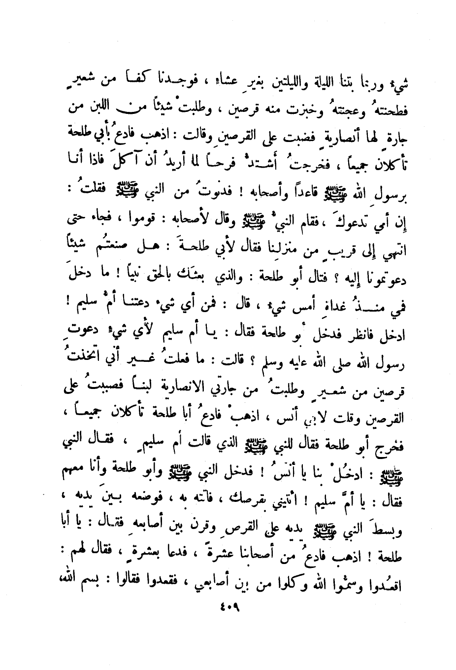 شيء وربما بتنا الليلة والليلتين بغير عشاء، فوجدنا كفا من شعير فطحنته وعجنته وخبزت منه قرصين، وطلبت شيئا من اللبن من جارة لها أنصارية فضبت على القرصين وقالت: اذهب فادع بأبي طلحة تأكلان جميعا، فخرجت أشتد فرحا لما أريد أن آكل فإذا أنا برسول الله صلى الله عليه وسلم قاعدا وأصحابه! فدنوت من النبي صلى الله عليه وسلم فقلت: إن أمي تدعوك، فقام النبي صلى الله عليه وسلم وقال لأصحابه: "قوموا"، فجاء حتى انتهى إلى قريب من منزلنا فقال لأبي طلحة: "هل صنعتم شيئا دعوتمونا إليه"؟ فقال أبو طلحة: والذي بعثك بالحق نبيا! ما دخل فمي منذ غداة أمس شيء، قال: "فمن أي شيء دعتنا أم سليم"! ادخل فانظر فدخل أبو طلحة فقال: يا أم سليم لأي شيء دعوت رسول الله صلى الله عليه وسلم؟ قالت: ما فعلت غير أني اتخذت قرصين من شعير وطلبت من جارتي الأنصارية لبنا فصببت على القرصين وقلت لأبني أنس، اذهب فادع أبا طلحة تأكلان جميعا، فخرج أبو طلحة فقال للنبي صلى الله عليه وسلم الذي قالت أم سليم، فقال النبي صلى الله عليه وسلم: "ادخل بنا يا أنس"! فدخل النبي صلى الله عليه وسلم وأبو طلحة وأنا معهم فقال: " يا أم سليم! أتيني بقرصك "، فأتته به، فوضعه بين يديه، وبسط النبي صلى الله عليه وسلم يديه على القرص وقرن بين أصابعه فقال: " يا أبا طلحة! اذهب فادعو من أصحابنا عشرة"، فدعا بعشرة، فقال لهم: " اقعدوا وسموا الله وكلوا من بين أصابعي"، فقعدوا فقالوا: بسم الله،