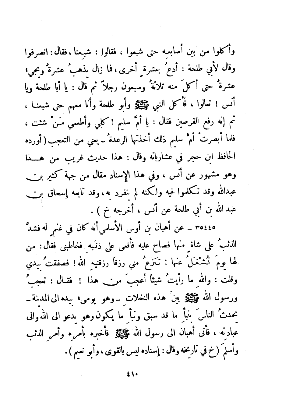 وأكلوا من بين أصابعه حتى شبعوا، فقالوا: شبعنا، فقال: "انصرفوا" وقال لأبي طلحة: أدع بعشرة أخرى، فما زال يذهب عشرة ويجيء عشرة حتى أكل منه ثلاثة وسبعون رجلا ثم قال: " يا أبا طلحة ويا أنس! تعالوا"، فأكل النبي صلى الله عليه وسلم وأبو طلحة وأنا معهم حتى شبعنا، ثم إنه رفع القرصين فقال: " يا أم سليم! كلي وأطعمي من شئت "، فلما أبصرت أم سليم ذلك أخذتها الرعدة - يعني من التعجب "أورده الحافظ ابن حجر في عشارياته وقال: هذا حديث غريب من هذا وهو مشهور عن أنس، وفي هذا الإسناد مقال من جهة كثير بن عبد الله وقد تكلموا فيه ولكنه لم ينفرد به، وقد تابعه إسحاق بن عبد الله بن أبي طلحة عن أنس، أخرجه خ".