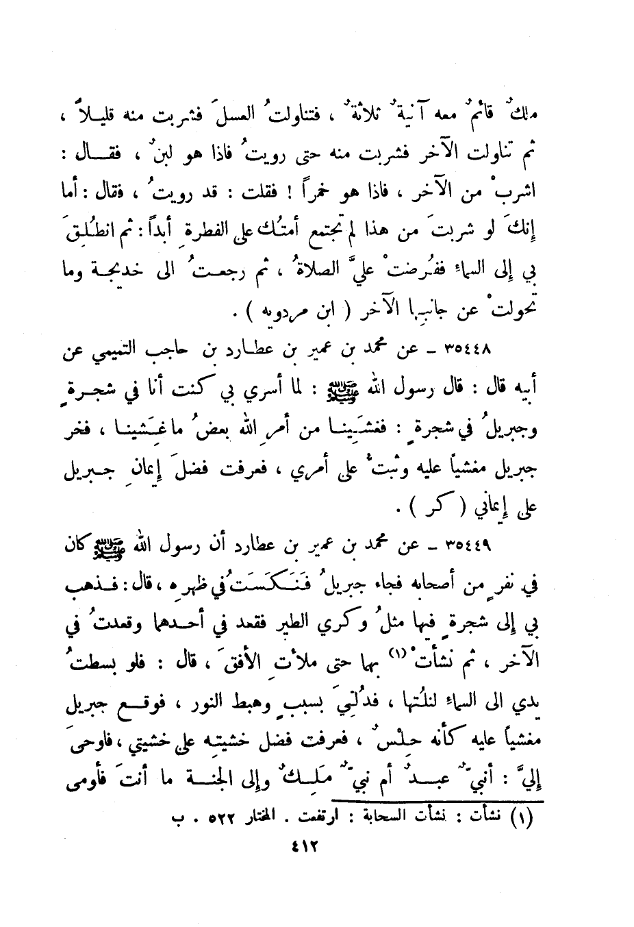 35449- عن محمد بن عمير بن عطارد " أن رسول الله صلى الله عليه وسلم كان في نفر من أصحابه فجاء جبريل فنكست في ظهره، قال: فذهب بي إلى شجرة فيها مثل وكري الطير فقعد في أحدهما وقعدت في الآخر، ثم نشأت 1 بهما حتى ملأت الأفق، قال: فلو بسطت يدي إلى السماء لنلتها، فدلي بسبب وهبط النور، فوقع جبريل مغشيا عليه كأنه حلس، فعرفت فضل خشيته على خشيتي، فأوحى إلي: أنبي عبد أم نبي ملك وإلى الجنة ما أنت فأومى