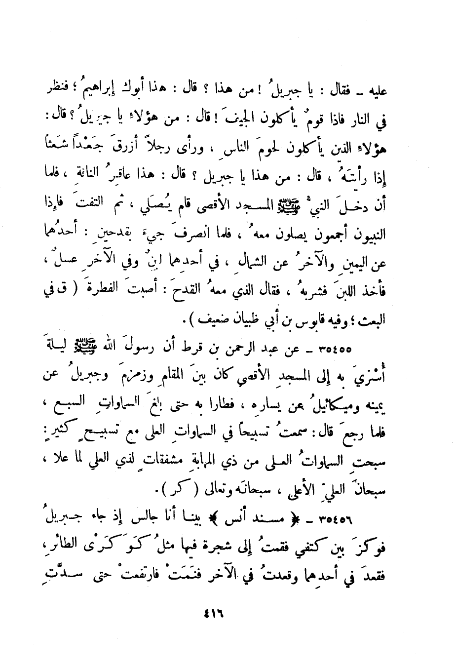 35456- "مسند أنسْ" " بينا أنا جالس إذ جاء جبريل فوكز بين كتفي فقمت إلى شجرة فيها مثل كوكرى الطائر، فقعد في أحدهما وقعدت في الآخر فنمت فارتفعت حتى سدت