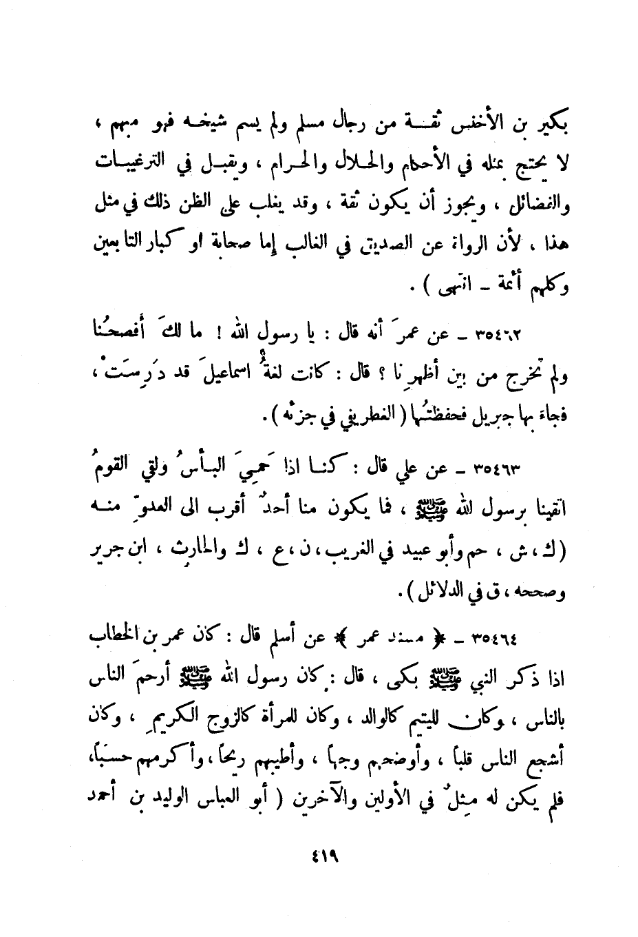35464- "مسند عمر" عن أسلم قال: كان عمر بن الخطاب إذا ذكر النبي صلى الله عليه وسلم بكى، قال: كان رسول الله صلى الله عليه وسلم أرحم الناس بالناس، وكان لليتيم كالوالد، وكان للمرأة كالزوج الكريم، وكان أشجع الناس قلبا، وأوضحهم وجها، وأطيبهم ريحا، وأكرمهم حسبا، فلم يكن له مثل في الأولين والآخرين. "أبو العباس الوليد بن أحمد