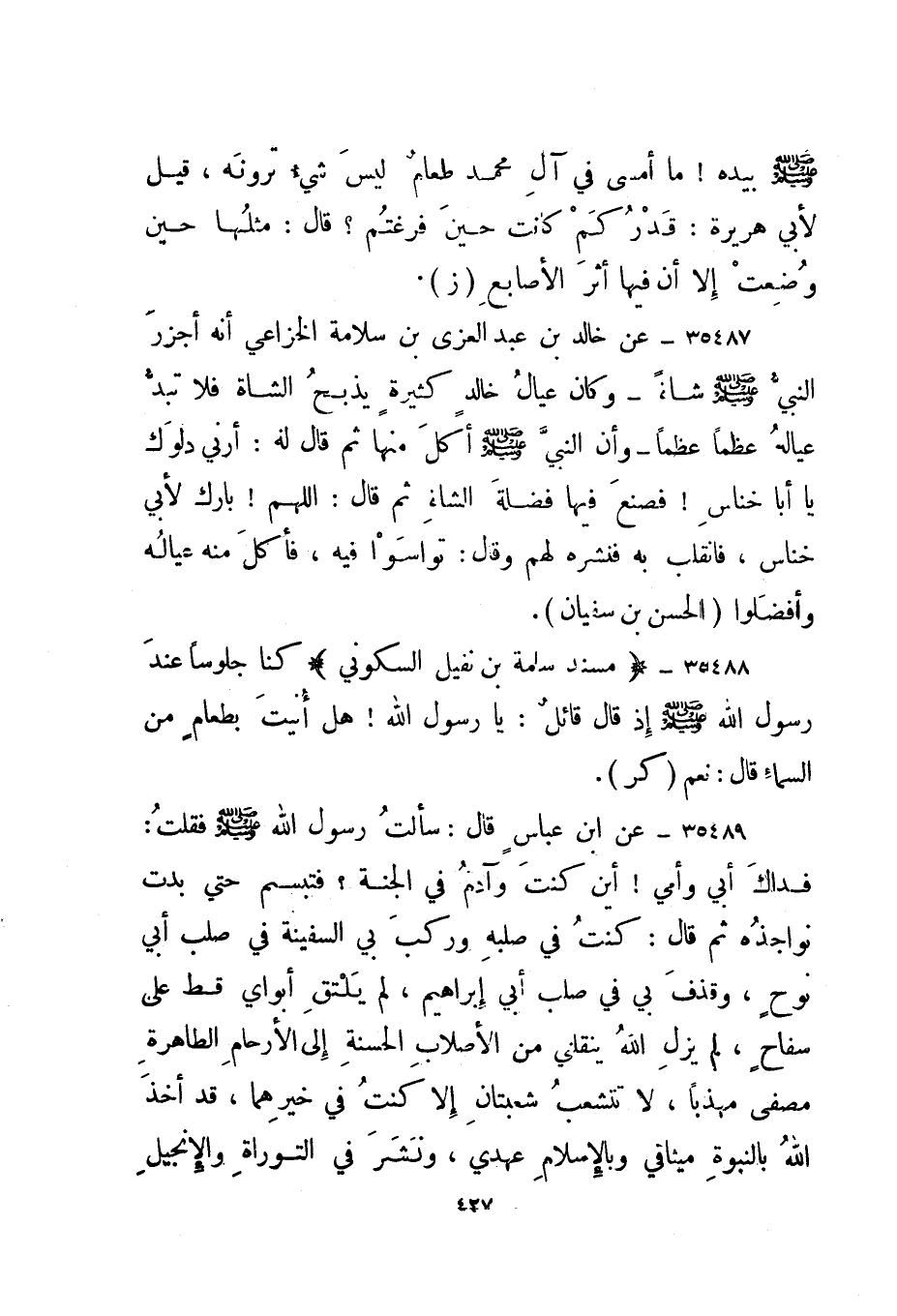 35488- "مسند سلمة بن نفيل السكوني" كنا جلوسا عند رسول الله صلى الله عليه وسلم إذ قال قائل: يا رسول الله! هل أتيت بطعام من السماء قال: "نعم". "كر".