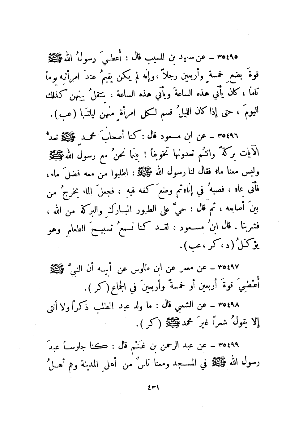 35495- عن سعيد بن المسيب قال: أعطي رسول الله صلى الله عليه وسلم قوة بضع خمسة وأربعين رجلا، وإنه لم يكن يقيم عند امرأته يوما تاما، كان يأتي هذه الساعة ويأتي هذه الساعة، ينتقل بينهن كذلك اليوم، حتى إذا كان الليل قسم لكل امرأة منهن ليلتها. "عب".