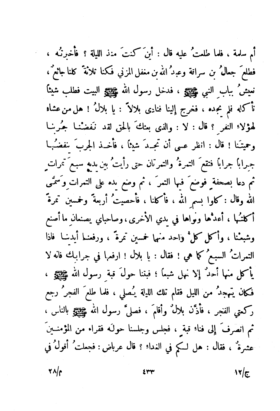 أم سلمة، فلما طلعت عليه قال: "أين كنت منذ الليلة"؟ فأخبرته، فطلع جعال بن سراقة وعبد الله بن مغفل المزني فكنا ثلاثة كلنا جائع، نعيش بباب النبي صلى الله عليه وسلم، فدخل رسول الله صلى الله عليه وسلم البيت فطلب شيئا نأكله فلم يجده، فخرج إلينا فنادى بلالا: " يا بلال! هل من عشاء لهؤلاء النفر"؟ قال: لا: والذي بعثك بالحق لقد نفضنا جربنا وحميتنا! قال: "انظر عسى أن تجد شيئا"، فأخذ الجرب ينفضها جرابا جرابا فتقع التمرة والتمرتان حتى رأيت بين يديه سبع تمرات ثم دعا بصحفة فوضع فيها التمر، ثم وضع يده على التمرات وسمى الله وقال: "كلوا بسم الله"، فأكلنا، فأحصيت أربعة وخمسين تمرة أكلتها، أعدها ونواها في يدي الأخرى، وصاحباي يصنعان ما أصنع وشبعنا، وأكل كل واحد منهما خمسين تمرة، ورفعنا أيدينا فإذا التمرات السبع كما هي! فقال: " يا بلال! ارفعها في جرابك فإنه لا يأكل منها أحد إلا نهل شبعا "؛ فبتنا حول قبة رسول الله صلى الله عليه وسلم، فكان يتهجد من الليل فقام تلك الليلة يصلي، فلما طلع الفجر رجع ركعتي الفجر، فأذن بلال وأقام، فصلى رسول الله صلى الله عليه وسلم بالناس، ثم انصرف إلى فناء قبة، فجلس وجلسنا حوله فقراء من المؤمنين عشرة، فقال: "هل لكم في الغداء"؟ قال عرباض: فجعلت أقول في