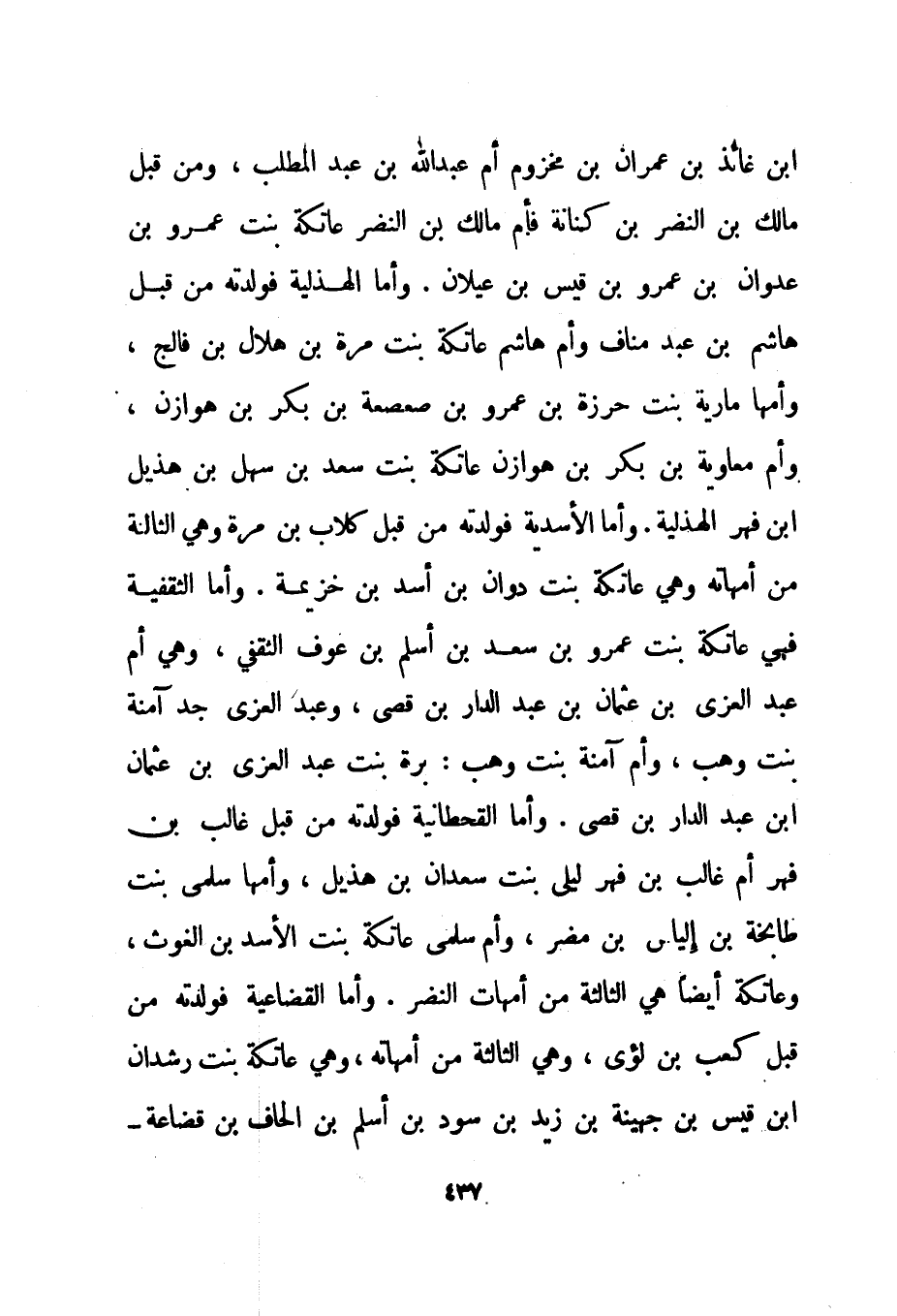 ابن غائذ بن عمران بن مخزوم أم عبد الله بن عبد المطلب، ومن قبل مالك بن النضر بن كنانة فأم مالك بن النضر عاتكة بنت عمرو بن عدوان بن عمرو بن قيس بن عيلان. وأما الهذلية فولدته من قبل هاشم بن عبد مناف وأم هاشم عاتكة بنت مرة بن هلال بن فالج، وأمها مارية بنت حرزة بن عمرو بن صعصعة بن بكر بن هوازن، وأم معاوية بن بكر بن هوازن عاتكة بنت سعد بن سهل بن هذيل ابن فهر الهذلية. وأما الأسدية فولدته من قبل كلاب بن مرة وهي الثالثة من أمهاته وهي عاتكة بنت دوان بن أسد بن خزيمة. وأما الثقفية فهي عاتكة بنت عمرو بن سعد بن أسلم بن عوف الثقفي، وهي أم عبد العزى بن عثمان بن عبد الدار بن قصي، وعبد العزى جد آمنة بنت وهب، وأم آمنة بنت وهب: برة بنت عبد العزى بن عثمان ابن عبد الدار بن قصي. وأما القحطانية فولدته من قبل غالب بن فهر أم غالب بن فهر ليلى بنت سعدان بن هذيل، وأمها سلمى بنت طابخة بن إلياس بن مضر، وأم سلمى عاتكة بنت الأسد بن الغوث، وعاتكة أيضا هي الثالثة من أمهات النضر. وأما القضاعية فولدته من قبل كعب بن لؤي، وهي الثالثة من أمهاته، وهي عاتكة بنت رشدان ابن قيس بن جهينة بن زيد بن سود بن أسلم بن الحاف بن قضاعة -