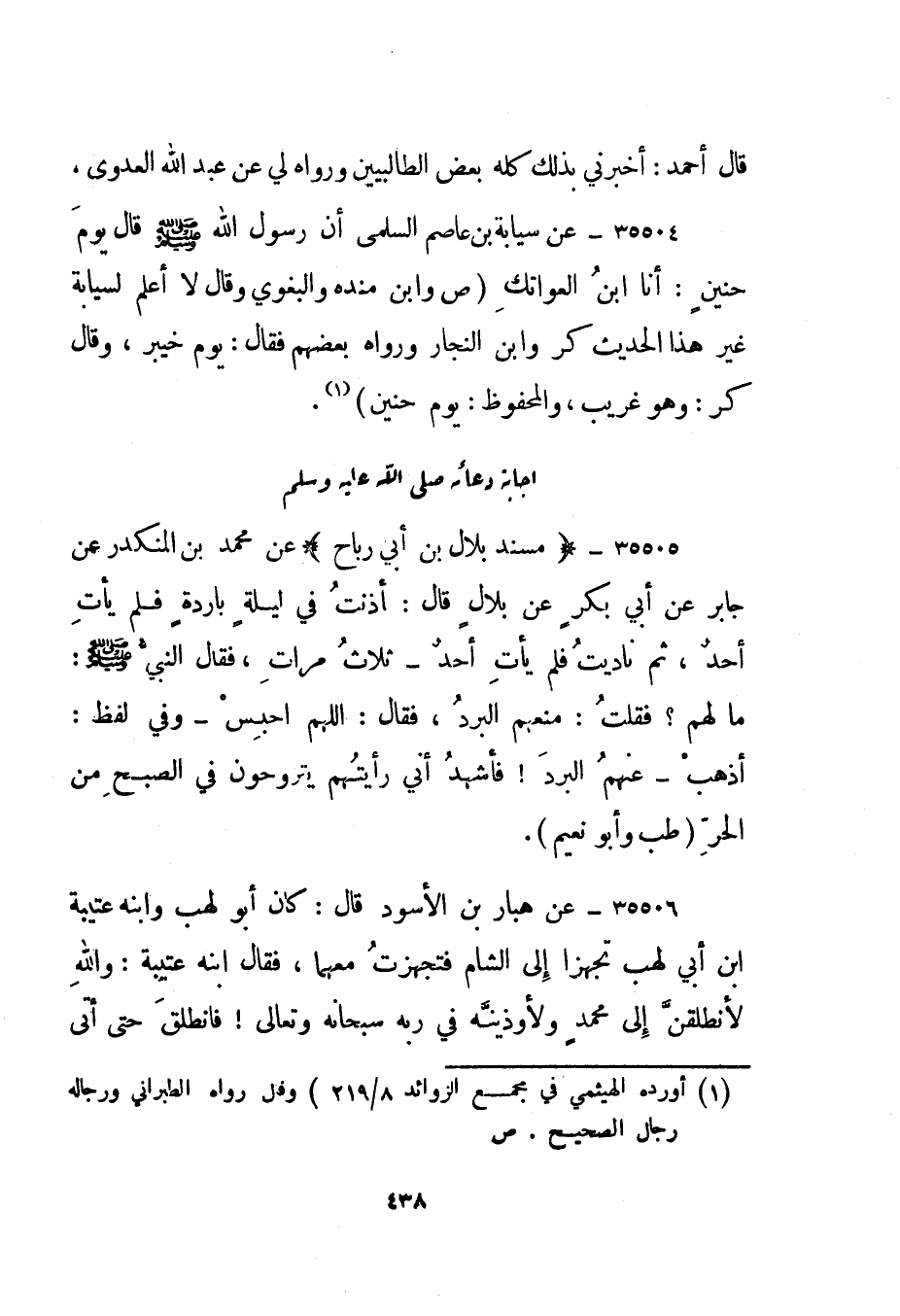 35505- "مسند بلال بن أبي رباح" عن محمد بن المنكدر عن جابر عن أبي بكر عن بلال قال: أذنت في ليلة باردة فلم يأت أحد، ثم ناديت فلم يأت أحد - ثلاث مرات، فقال النبي صلى الله عليه وسلم: "ما لهم"؟ فقلت: منعهم البرد، فقال: "اللهم احبس" - وفي لفظ: أذهب - عنهم البرد! فأشهد أني رأيتهم يتروحون في الصبح من الحر. "طب وأبو نعيم".