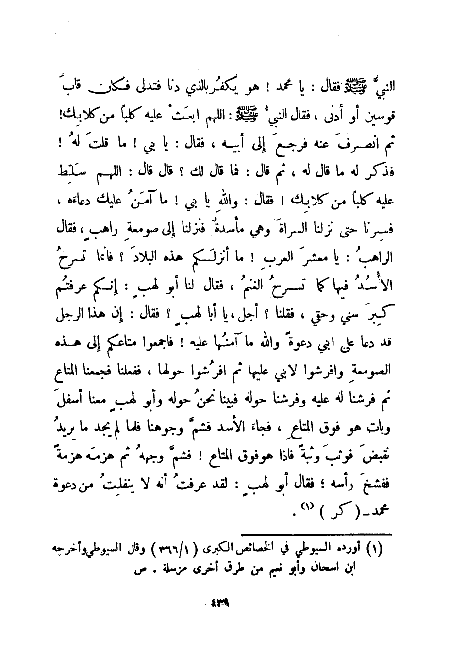 النبي صلى الله عليه وسلم فقال: يا محمد! هو يكفر بالذي دنا فتدلى فكان قاب قوسين أو أدنى، فقال النبي صلى الله عليه وسلم: "اللهم ابعث عليه كلبا من كلابك"! ثم انصرف عنه فرجع إلى أبيه، فقال: يا بني! ما قلت له! فذكر له ما قال له، ثم قال: فما قال لك؟ قال قال: اللهم سلط عليه كلبا من كلابك! فقال: والله يا بني! ما آمن عليك دعاءه، فسرنا حتى نزلنا السراة وهي مأسدة فنزلنا إلى صومعة راهب، فقال الراهب: يا معشر العرب! ما أنزلكم هذه البلاد؟ فإنما تسرح الأسد فيها كما تسرح الغنم، فقال لنا أبو لهب: إنكم عرفتم كبر سني وحقي، فقلنا؟ أجل، يا أبا لهب؟ فقال: إن هذا الرجل قد دعا على ابني دعوة والله ما آمنها عليه! فاجمعوا متاعكم إلى هذه الصومعة وافرشوا لابني عليها ثم افرشوا حولها، ففعلنا فجمعنا المتاع ثم فرشنا له عليه وفرشنا حوله فبينا نحن حوله وأبو لهب معنا أسفل وبات هو فوق المتاع، فجاء الأسد فشم وجوهنا فلما لم يجد ما يريد انقبض فوثب وثبة فإذا هو فوق المتاع! فشم وجهه ثم هزمه هزمة ففشخ رأسه؛ فقال أبو لهب: لقد عرفت أنه لا ينفلت من دعوة محمد. "كر"1.