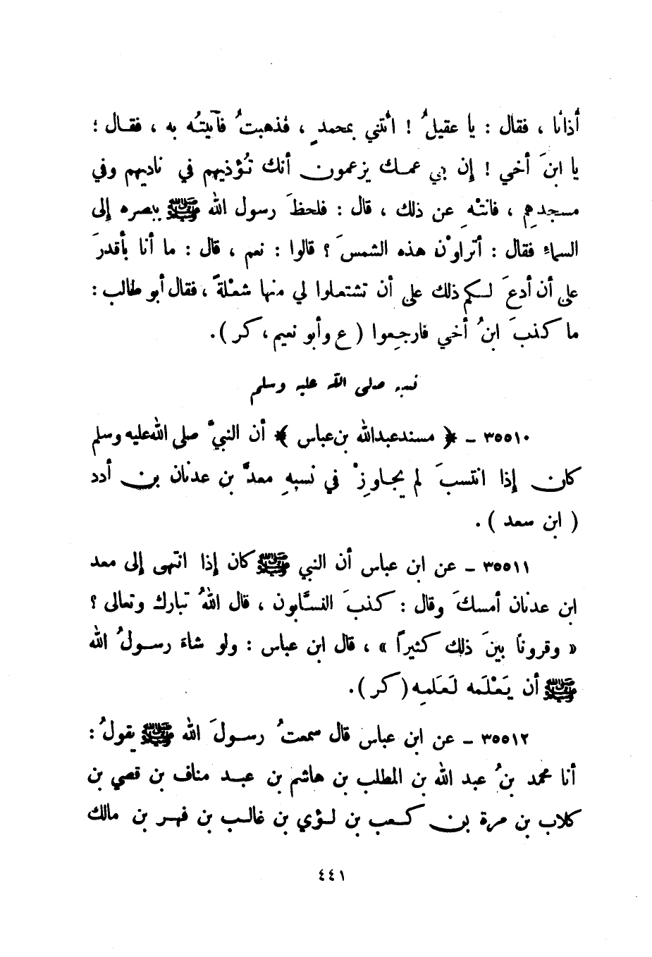 35510- "مسند عبد الله بن عباس" أن النبي صلى الله عليه وسلم كان إذا انتسب لم يجاوز في نسبه معد بن عدنان بن أدد. "ابن سعد".