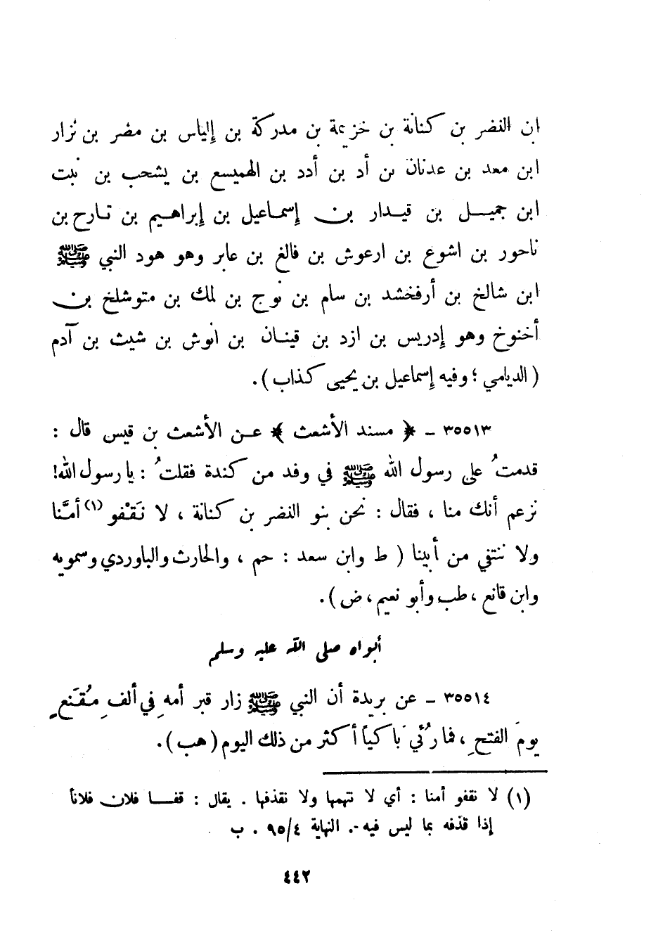 35513- "مسند الأشعث" عن الأشعث بن قيس قال: قدمت على رسول الله صلى الله عليه وسلم في وفد من كندة فقلت: يا رسول الله! نزعم أنك منا، فقال: " نحن بنو النضر بن كنانة، لا نقفو 1 أمنا ولا ننتفي من أبينا". "ط وابن سعد: حم، والحارث والباوردي وسمويه وابن قانع، طب وأبو نعيم، ض".