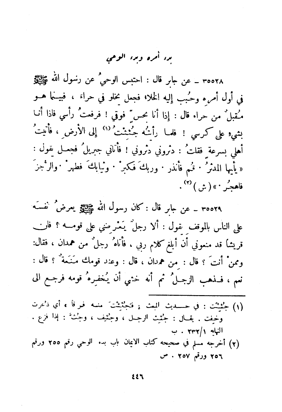 35528- عن جابر قال: احتبس الوحي عن رسول الله صلى الله عليه وسلم في أول أمره وحبب إليه الخلاء فجعل يخلو في حراء، فبينما هو مقبل من حراء قال: إذا أنا بحس فوقي! فرفعت رأسي فإذا أنا بشيء على كرسي! فلما رأيته جئثت 1 إلى الأرض، فأتيت أهلي بسرعة فقلت: دثروني دثروني! فأتاني جبريل فجعل يقول: {يَا أَيُّهَا الْمُدَّثِّرُ قُمْ فَأَنْذِرْ وَرَبَّكَ فَكَبِّرْ وَثِيَابَكَ فَطَهِّرْ وَالرُّجْزَ فَاهْجُرْ} . "ش"2.