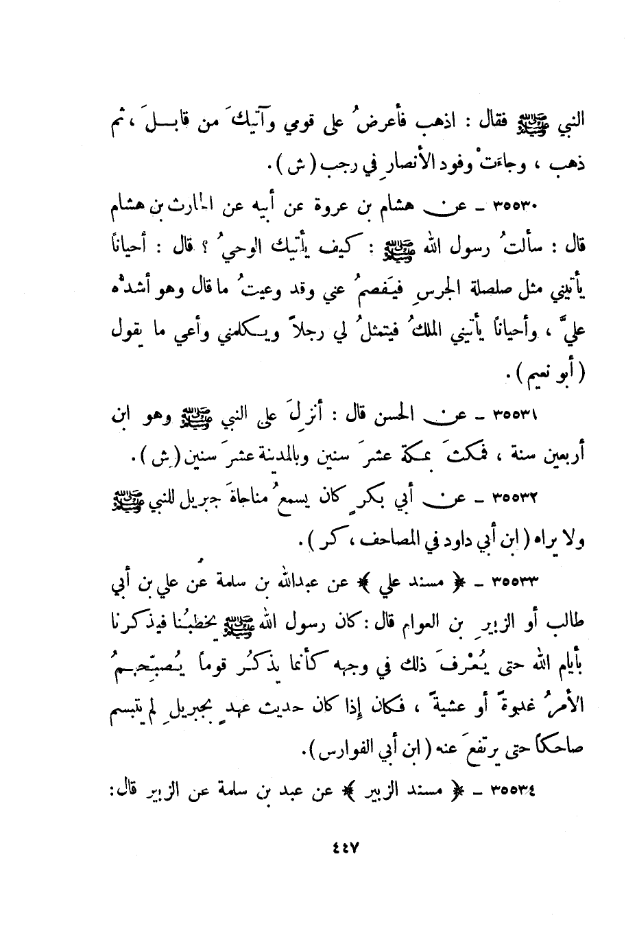 35532- عن أبي بكر كان يسمع مناجاة جبريل للنبي صلى الله عليه وسلم ولا يراه. "ابن أبي داود في المصاحف، كر".