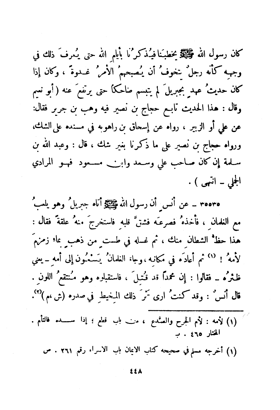 35535- عن أنس أن رسول الله صلى الله عليه وسلم أتاه جبريل وهو يلعب مع الغلمان، فأخذه فصرعه فشق قلبه فاستخرج منه علقة فقال: هذا حظ الشيطان منك، ثم غسله في طست من ذهب بماء زمزم لأمه! 1 ثم أعاده في مكانه، وجاء الغلمان يسعون إلى أمه - يعني ظئره - فقالوا: إن محمدا قد قتل، فاستقبلوه وهو منتقع اللون. قال أنس: وقد كنت أرى أثر ذلك المخيط في صدره. "ش، م"2.