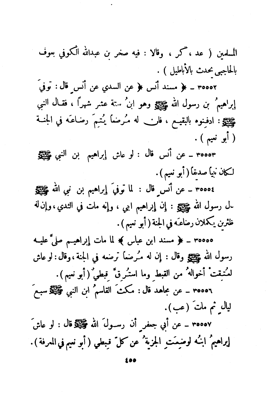 35555- "مسند ابن عباس" لما مات إبراهيم صلى عليه رسول الله صلى الله عليه وسلم وقال: إن له مرضعا ترضعه في الجنة، وقال: لو عاش لعتقت أخواله من القبط وما استرق قبطي. "أبو نعيم".