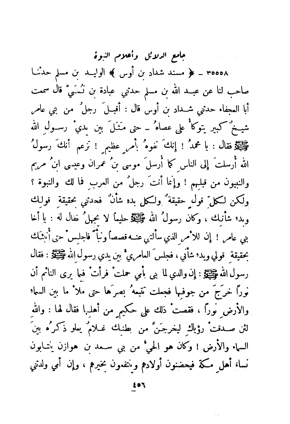 35558- "مسند شداد بن أوس" الوليد بن مسلم حدثنا صاحب لنا عن عبد الله بن مسلم حدثني عبادة بن نسي قال سمعت أبا العجفاء حدثني شداد بن أوس قال: أقبل رجل من بني عامر شيخ كبير يتوكأ على عصاه - حتى مثل بين يدي رسول الله صلى الله عليه وسلم فقال: يا محمد! إنك تفوه بأمر عظيم! تزعم أنك رسول الله أرسلت إلى الناس كما أرسل موسى بن عمران وعيسى ابن مريم والنبيون من قبلهم! وإنما أنت رجل من العرب فما لك والنبوة؟ ولكن لكل قول حقيقة ولكل بدء شأن فحدثني بحقيقة قولك وبدء شأنك، وكان رسول الله صلى الله عليه وسلم حليما لا يجهل فقال له: " يا أخا بني عامر! إن للأمر الذي سألتني عنه قصصا ونبأ فاجلس حتى أنبئك بحقيقة قولي وبدء شأني "، فجلس العامري بين يدي رسول الله صلى الله عليه وسلم: فقال رسول الله صلى الله عليه وسلم: " إن والدي لما بنى بأمي حملت فرأت فيما يرى النائم أن نورا خرج من جوفها فجعلت تتبعه بصرها حتى ملأ ما بين السماء والأرض نورا، فقصت ذلك على حكيم من أهلها فقال لها: والله لئن صدقت رؤياك ليخرجن من بطنك غلام يعلو ذكره بين السماء والأرض! وكان هو الحي من بني سعد بن هوازن ينتابون نساء أهل مكة فيحضنون أولادهم وينتفعون بخيرهم، وإن أمي ولدتني
