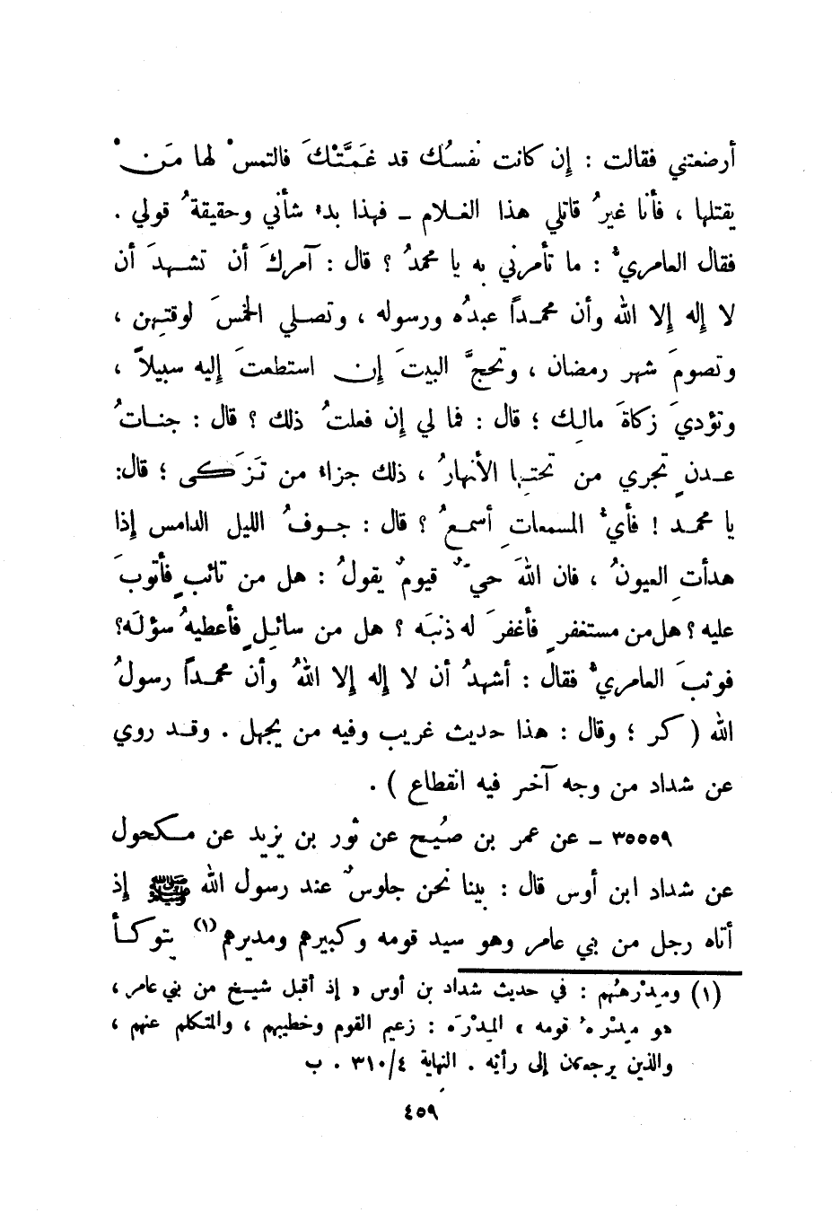 أرضعتني فقالت: إن كانت نفسك قد غمتك فالتمس لها من يقتلها، فأنا غير قاتلي هذا الغلام - فهذا بدء شأني وحقيقة قولي. فقال العامري: ما تأمرني به يا محمد؟ قال: آمرك أن تشهد أن لا إله إلا الله وأن محمدا عبده ورسوله، وتصلي الخمس لوقتهن، وتصوم شهر رمضان، وتحج البيت إن استطعت إليه سبيلا، وتؤدي زكاة مالك؛ قال: فما لي إن فعلت ذلك؟ قال: جنات عدن تجري من تحتها الأنهار، ذلك جزاء من تزكى؛ قال: يا محمد! فأي المسمعات أسمع؟ قال: جوف الليل الدامس إذا هدأت العيون، فإن الله حي قيوم يقول: هل من تائب فأتوب عليه؟ هل من مستغفر فأغفر له ذنبه؟ هل من سائل فأعطيه سؤله؟ فوثب العامري فقال: أشهد أن لا إله إلا الله وأن محمدا رسول الله". "كر؛ وقال: هذا حديث غريب وفيه من يجهل. وقد روي عن شداد من وجه آخر فيه انقطاع".