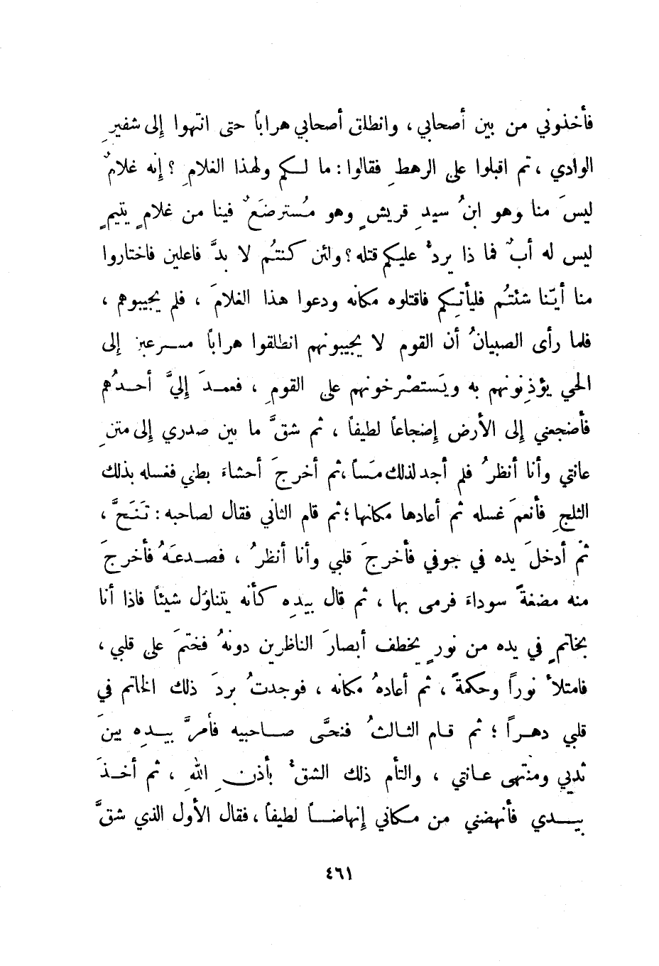 فأخذوني من بين أصحابي، وانطلق أصحابي هرابا حتى انتهوا إلى شفير الوادي، ثم أقبلوا على الرهط فقالوا: ما لكم ولهذا الغلام؟ إنه غلام ليس منا وهو ابن سيد قريش وهو مسترضع فينا من غلام يتيم ليس له أب فماذا يرد عليكم قتله؟ ولئن كنتم لا بد فاعلين فاختاروا منا أينا شئتم فليأتكم فاقتلوه مكانه ودعوا هذا الغلام، فلم يجيبوهم، فلما رأى الصبيان أن القوم لا يجيبونهم انطلقوا هرابا مسرعين إلى الحي يؤذنونهم به ويستصرخونهم على القوم، فعمد إلي أحدهم فأضجعني إلى الأرض إضجاعا لطيفا، ثم شق ما بين صدري إلى متن عانتي وأنا أنظر فلم أجد لذلك مسا، ثم أخرج أحشاء بطني فغسله بذلك الثلج فأنعم غسله ثم أعادها مكانها؛ ثم قام الثاني فقال لصاحبه: تنح، ثم أدخل يده في جوفي فأخرج قلبي وأنا أنظر، فصدعه فأخرج منه مضغة سوداء فرمى بها، ثم قال بيده كأنه يتناول شيئا فإذا أنا بخاتم في يده من نور يخطف أبصار الناظرين دونه فختم على قلبي، فامتلأ نورا وحكمة، ثم أعاده مكانه، فوجدت برد ذلك الخاتم في قلبي دهرا؛ ثم قام الثالث فنحى صاحبيه فأمر بيده بين ثديي ومنتهى عانتي، والتأم ذلك الشق بأذن الله، ثم أخذ بيدي فأنهضني من مكاني إنهاضا لطيفا، فقال الأول الذي شق