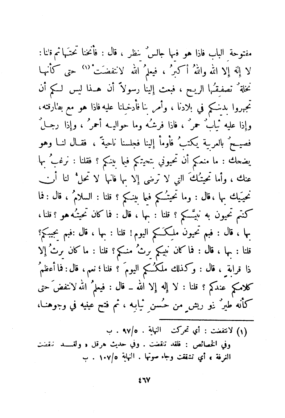 مفتوحة الباب فإذا هو فيها جالس ينظر، قال: فأنخنا تحتها ثم قلنا: لا إله إلا الله والله أكبر، فيعلم الله لانتفضت 1 حتى كأنها نخلة تصفقها الريح، فبعث إلينا رسولا أن هذا ليس لكم أن تجهروا بدينكم في بلادنا، وأمر بنا فأدخلنا عليه فإذا هو مع بطارقته، وإذا عليه ثياب حمر، فإذا فرشه وما حواليه أحمر، وإذا رجل فصيح بالعربية يكتب فأومأ إلينا فجلسنا ناحية، فقال لنا وهو يضحك: ما منعكم أن تحيوني بتحيتكم فيما بينكم؟ فقلنا: نرغب بها عنك، وأما تحيتك التي لا ترضى إلا بها فإنها لا تحل لنا أن نحييك بها، قال: وما تحيتكم فيما بينكم؟ قلنا: السلام، قال: فما كنتم تحيون به نبيكم؟ قلنا: بها، قال: فما كان تحيته هو؟ قلنا، بها، قال: فبم تحيون ملككم اليوم! قلنا: بها، قال: فبم يجيبكم؟ قلنا: بها، قال: فما كان نبيكم يرث منكم؟ قلنا: ما كان يرث إلا ذا قرابة، قال: وكذلك ملككم اليوم؟ قلنا؛ نعم، قال: فما أعظم كلامكم عندكم؟ قلنا: لا إله إلا الله - قال: فيعلم الله لانتفض حتى كأنه طير ذو ريش من حسن ثيابه، ثم فتح عينيه في وجوهنا،