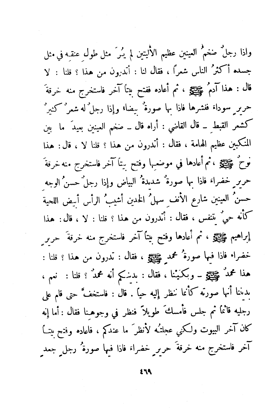 وإذا رجل ضخم العينين عظيم الأليتين لم ير مثل طول عنقه في مثل جسده أكثر الناس شعرا، فقال لنا: أتدرون من هذا؟ قلنا: لا قال: هذا آدم صلى الله عليه وسلم، ثم أعاده ففتح بيتا آخر فاستخرج منه خرقة حرير سوداء فنشرها فإذا بها صورة بيضاء وإذا رجل له شعر كثير كشعر القبط - قال القاضي: أراه قال - ضخم العينين بعيد ما بين المنكبين عظيم الهامة، فقال: أتدرون من هذا؟ قلنا لا، قال: هذا نوح صلى الله عليه وسلم، ثم أعادها في موضعها وفتح بيتا آخر فاستخرج منه خرقة حرير خضراء فإذا بها صورة شديدة البياض وإذا رجل حسن الوجه حسن العينين شارع الأنف سهل الخدين أشيب الرأس أبيض اللحية كأنه حي يتنفس، فقال: أتدرون من هذا؟ قلنا: لا، قال: هذا إبراهيم صلى الله عليه وسلم، ثم أعادها وفتح بيتا آخر فاستخرج منه خرقة حرير خضراء فإذا فيها صورة محمد صلى الله عليه وسلم، فقال: تدرون من هذا؟ قلنا: هذا محمد صلى الله عليه وسلم - وبكينا، فقال: بدينكم أنه محمد؟ قلنا: نعم، بديننا أنها صورته كأنما ننظر إليه حيا. قال: فاستخف حتى قام على رجليه قائما ثم جلس فأمسك طويلا فنظر في وجوهنا فقال: أما إنه كان آخر البيوت ولكني عجلته لأنظر ما عندكم، فأعاده وفتح بيتا آخر فاستخرج منه خرقة حرير خضراء فإذا فيها صورة رجل جعد
