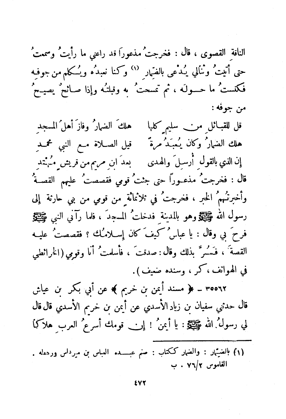 الناقة القصوى، قال: فخرجت مذعورا قد راعني ما رأيت وسمعت حتى أتيت وثنا لي يدعى بالضمار 1 وكنا نعبده ويكلم من جوفه فكنست ما حوله، ثم تمسحت به وقبلته وإذا صائح يصيح من جوفه: