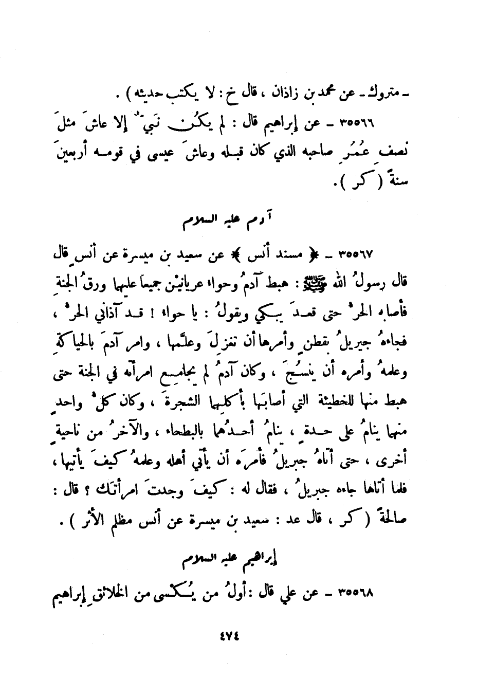 35567- "مسند أنس" عن سعيد بن ميسرة عن أنس قال قال رسول الله صلى الله عليه وسلم: "هبط آدم وحواء عريانين جميعا عليهما ورق الجنة فأصابه الحر حتى قعد يبكي ويقول: يا حواء! قد آذاني الحر، فجاءه جبريل بقطن وأمرها أن تغزل وعلمها، وأمر آدم بالحياكة وعلمه وأمره أن ينسج، وكان آدم لم يجامع امرأته في الجنة حتى هبط منها للخطيئة التي أصابها بأكلهما الشجرة، وكان كل واحد منهما ينام على حدة، ينام أحدهما بالبطحاء، والآخر من ناحية أخرى، حتى أتاه جبريل فأمره أن يأتي أهله وعلمه كيف يأتيها، فلما أتاها جاءه جبريل، فقال له: كيف وجدت امرأتك؟ قال: صالحة ". "كر، قال عد: سعيد بن ميسرة عن أنس مظلم الأثر".