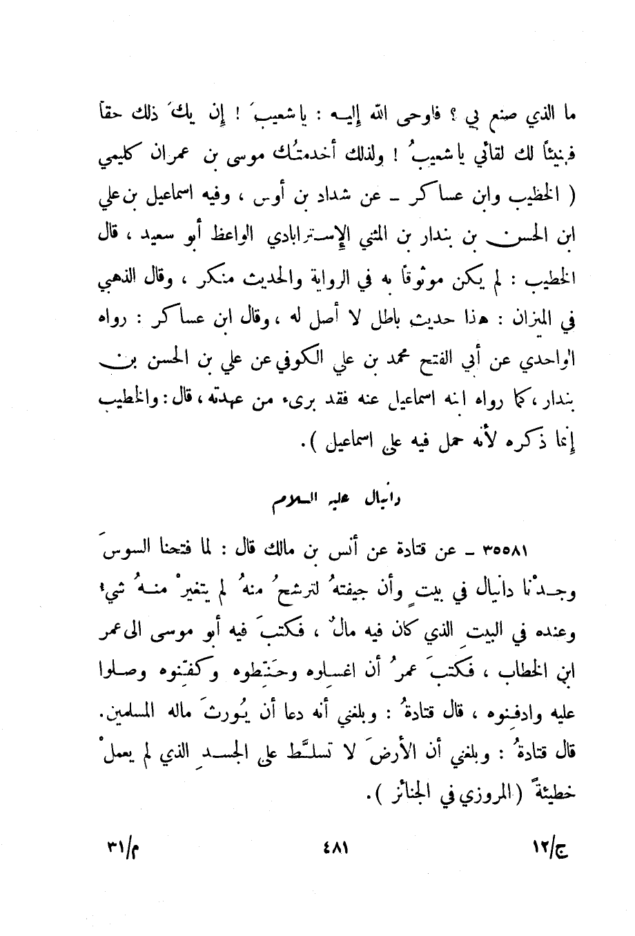 35581- عن قتادة عن أنس بن مالك قال: لما فتحنا السوس وجدنا دانيال في بيت وأن جيفته لترشح منه لم يتغير منه شيء وعنده في البيت الذي كان فيه مال، فكتب فيه أبو موسى إلى عمر ابن الخطاب، فكتب عمر أن اغسلوه وحنطوه وكفنوه وصلوا عليه وادفنوه، قال قتادة: وبلغني أنه دعا أن يورث ماله المسلمين. قال قتادة: وبلغني أن الأرض لا تسلط على الجسد الذي لم يعمل خطيئة. "المروزي في الجنائز".