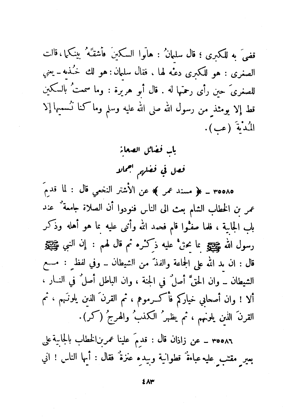 35585- "مسند عمر" عن الأشتر النخعي قال: لما قدم عمر بن الخطاب الشام بعث إلى الناس فنودوا أن الصلاة جامعة عند باب الجابية، فلما صفوا قام فحمد الله وأثنى عليه بما هو أهله وذكر رسول الله صلى الله عليه وسلم بما يحق عليه ذكره ثم قال لهم: إن النبي صلى الله عليه وسلم قال: " إن يد الله على الجماعة والفذ من الشيطان - وفي لفظ: مع الشيطان - وإن الحق أصل في الجنة، وإن الباطل أصل في النار، ألا! وإن أصحابي خياركم فأكرموهم، ثم القرن الذين يلونهم، ثم القرن الذين يلونهم، ثم يظهر الكذب والهرج". "كر".