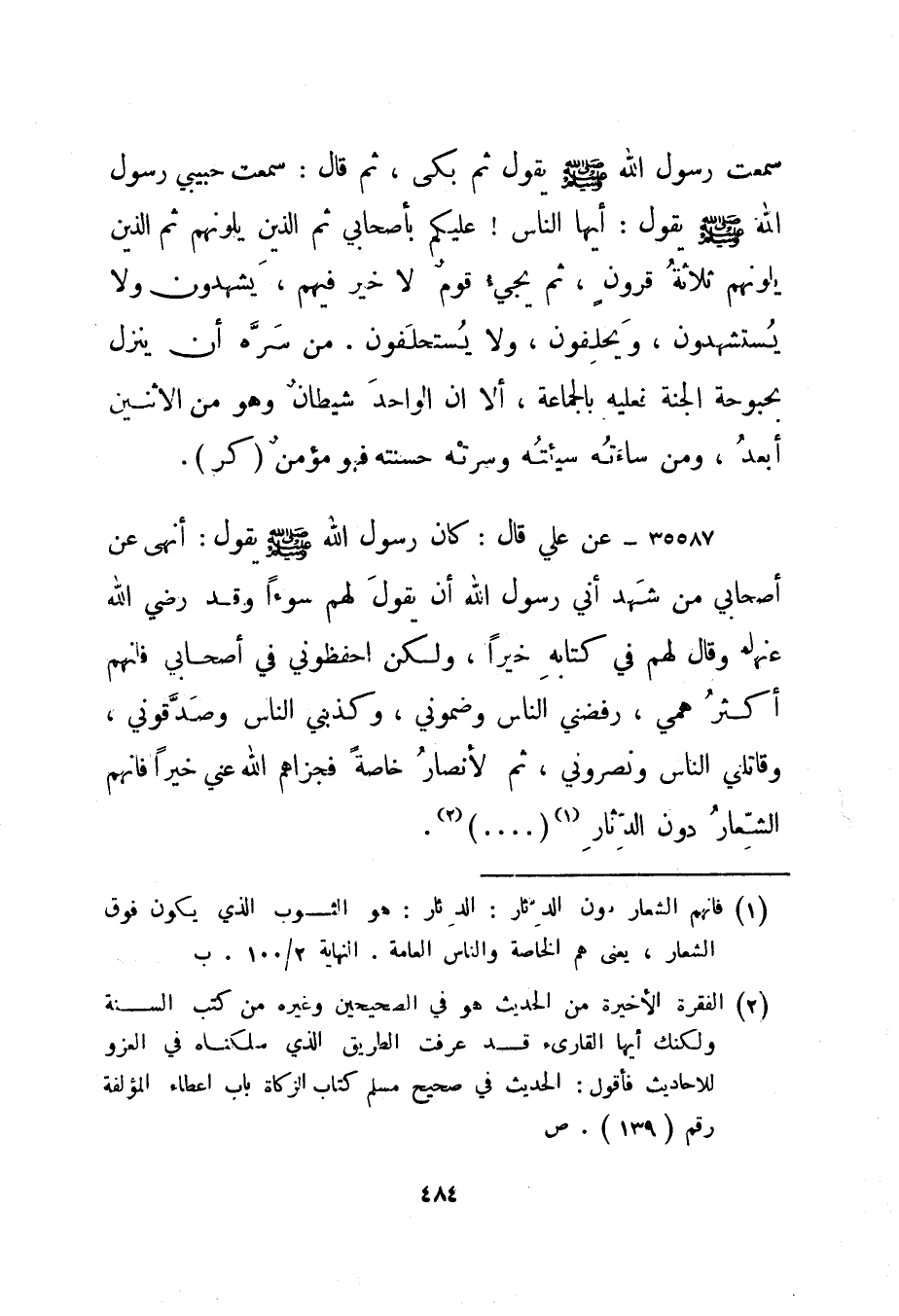 35587- عن علي قال: كان رسول الله صلى الله عليه وسلم يقول: " أنهى عن أصحابي من شهد أني رسول الله أن يقول لهم سوءا وقد رضي الله عنهم وقال لهم في كتابه خيرا، ولكن احفظوني في أصحابي فإنهم أكثر همي، رفضني الناس وضموني، وكذبني الناس وصدقوني، وقاتلني الناس ونصروني، ثم لأنصار خاصة فجزاهم الله عني خيرا فإنهم الشعار دون الدثار". 1 "...." 2.