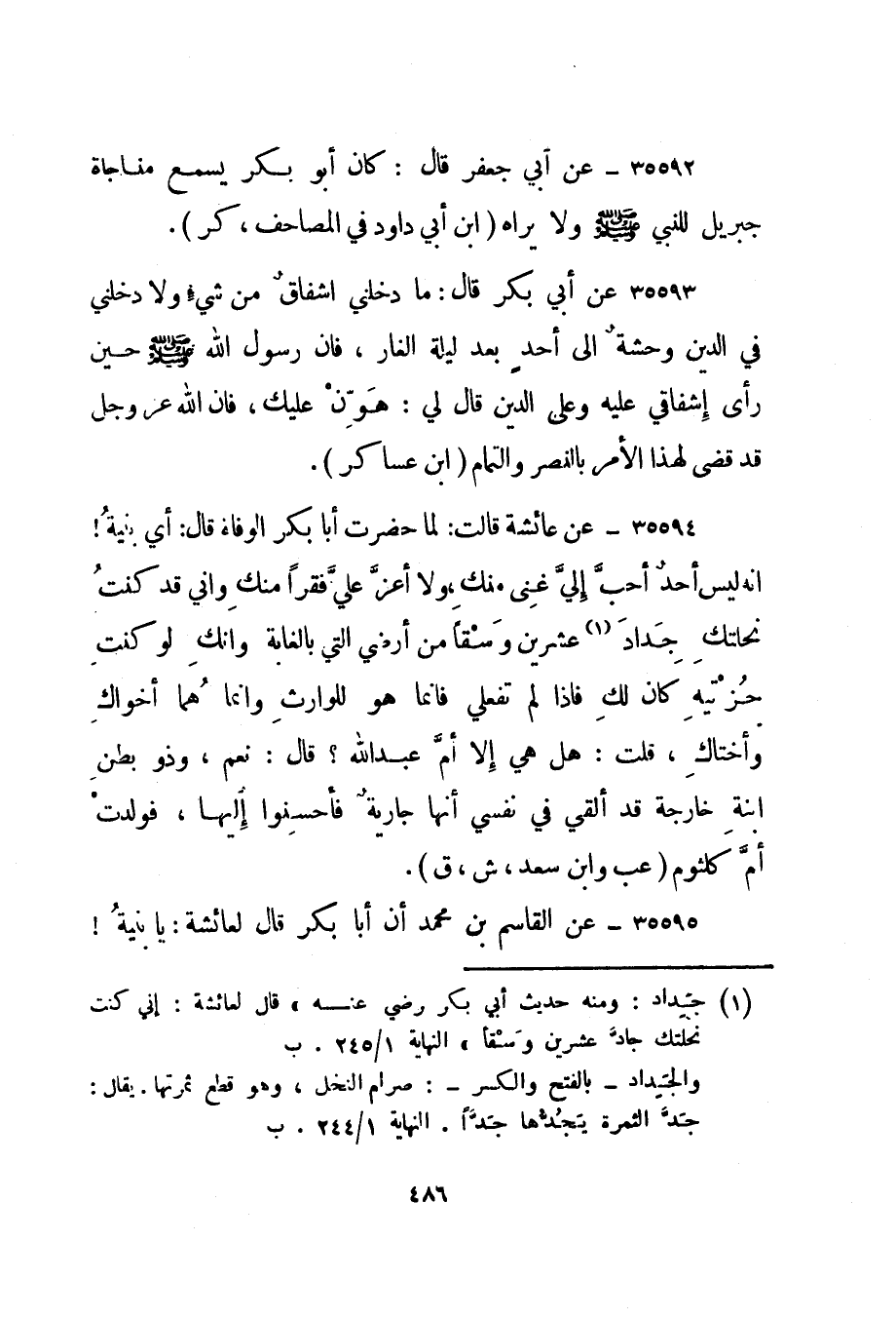 35594- عن عائشة قالت: لما حضرت أبا بكر الوفاة قال: أي بنية! إنه ليس أحد أحب إلي غنى منك، ولا أعز علي فقرا منك وإني قد كنت نحلتك جداد 1 عشرين وسقا من أرضي التي بالغابة وإنك لو كنت حزتيه كان لك فإذا لم تفعلي إنما هو للوارث وإنما هما أخواك وأختاك، قلت: هل هي إلا أم عبد الله؟ قال: نعم، وذو بطن ابنة خارجة قد ألقي في نفسي أنها جارية فأحسنوا إليها، فولدت أم كلثوم. "عب وابن سعد، ش، ق".