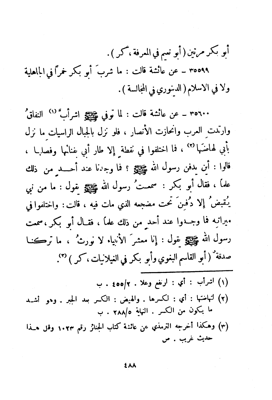 35600- عن عائشة قالت: لما توفي صلى الله عليه وسلم اشرأب 1، النفاق وارتدت العرب وانحازت الأنصار، فلو نزل بالجبال الراسيات ما نزل بأبي لهاضها 2، فما اختلفوا في نقطة إلا طار أبي بفنائها وفصلها، قالوا: أين يدفن رسول الله صلى الله عليه وسلم؟ فما وجدنا عند أحد من ذلك علما، فقال أبو بكر: سمعت رسول الله صلى الله عليه وسلم يقول: " ما من نبي يقبض إلا دفن تحت مضجعه الذي مات فيه"، قالت: واختلفوا في ميراثه فما وجدوا عند أحد من ذلك علما، فقال أبو بكر، سمعت رسول الله صلى الله عليه وسلم يقول: " إنا معشر الأنبياء لا نورث، ما تركنا صدقة". "أبو القاسم البغوي وأبو بكر في الغيلانيات، كر"3.