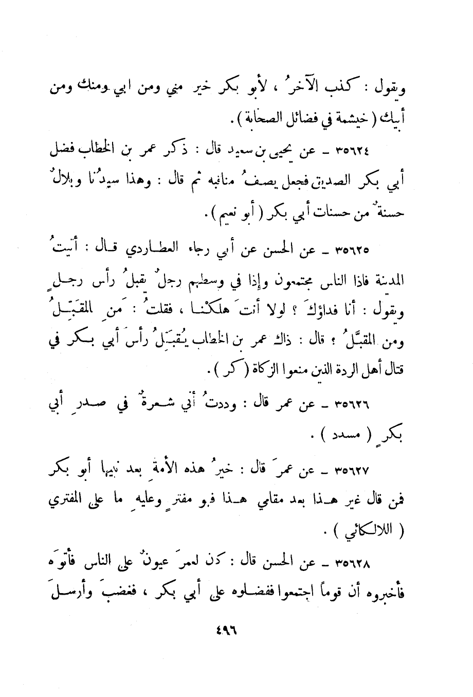 35627- عن عمر قال: خير هذه الأمة بعد نبيها أبو بكر فمن قال غير هذا بعد مقامي هذا فهو مفتر وعليه ما على المفتري. "اللالكائي".