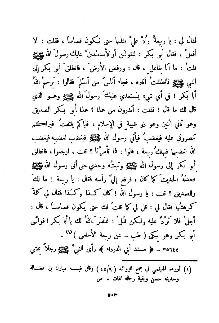 فقال لي: يا ربيعة رد علي مثلها حتى تكون قصاصا، فقلت: لا أفعل، فقال أبو بكر: لتقولن أو لأستعدين عليك رسول الله صلى الله عليه وسلم قلت: ما أنا بفاعل، قال: ورفض الأرض، فانطلق أبو بكر إلى النبي صلى الله عليه وسلم فانطلقت أتلوه، فجاء أناس من أسلم فقالوا: يرحم الله أبا بكر! في أي شيء يستعدي عليك رسول الله صلى الله عليه وسلم وهو الذي قال لك ما قال! فقلت: أتدرون من هذا؟ هذا أبو بكر الصديق وهو ثاني اثنين وهو ذو شيبة في الإسلام، فإياكم يلتفت فيراكم تنصروني عليه فيغضب فيأتي رسول الله صلى الله عليه وسلم فيغضب لغضبه فيغضب الله لغضبهما فيهلك ربيعة، قالوا: فما تأمرنا؟ قلت، ارجعوا، فانطلق أبو بكر إلى رسول الله صلى الله عليه وسلم وتبعته وحدي حتى أتى رسول الله صلى الله عليه وسلم فحدثه الحديث كما كان، فرفع إلي رأسه فقال: " يا ربيعة! ما لك وللصديق"؟ قلت: يا رسول الله! كان كذا وكذا فقال لي كلمة كرهتها فقال لي: قل لي كما قلت لك حتى يكون قصاصا، قال: أجل فلا ترد عليه ولكن قل: " غفر الله لك يا أبا بكر"! فولى أبو بكر وهو يبكي. "طب - عن ربيعة الأسلمي"1.