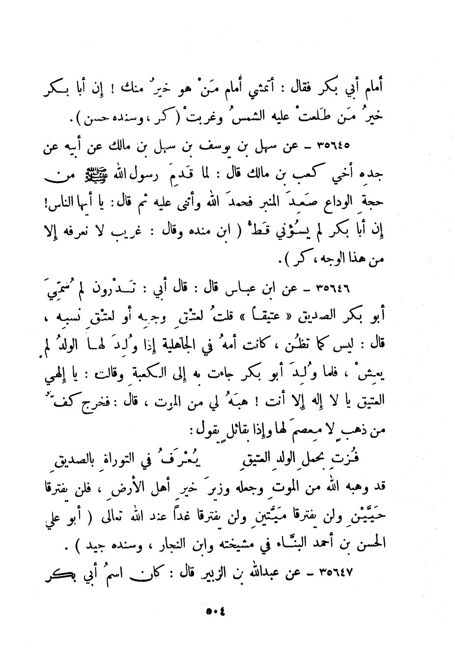 35646- عن ابن عباس قال: قال أبي: تدرون لم سمي أبو بكر الصديق "عتيقا" قلت لعتق وجهه أو لعتق نسبه، قال: ليس كما تظن، كانت أمه في الجاهلية إذا ولد لها الولد لم يعش، فلما ولد أبو بكر جاءت به إلى الكعبة وقالت: يا إلهي العتيق يا لا إله إلا أنت! هبه لي من الموت، قال: فخرج كف من ذهب لا معصم لها وإذا بقائل يقول: