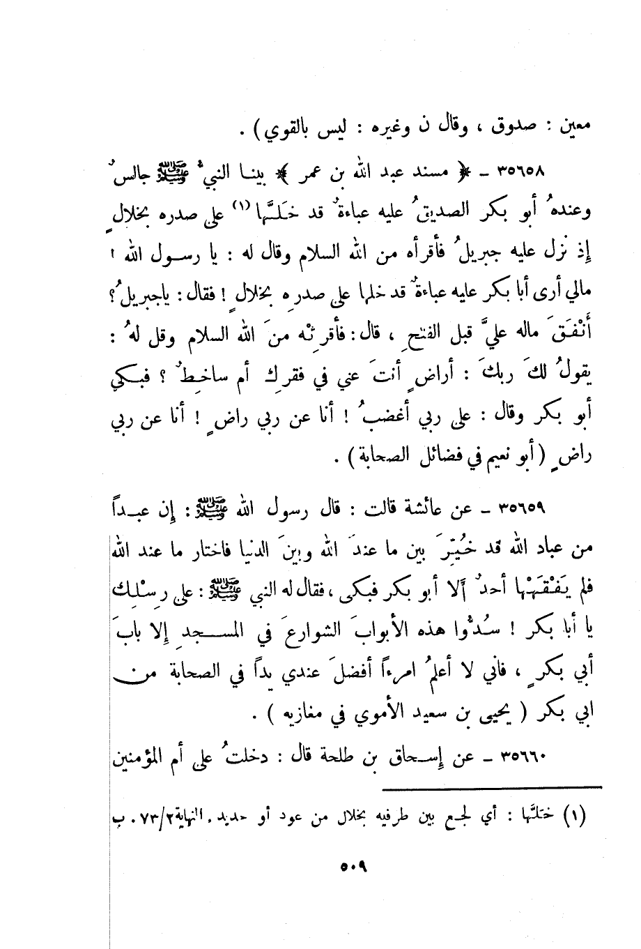 35658- "مسند عبد الله بن عمر" بينا النبي صلى الله عليه وسلم جالس وعنده أبو بكر الصديق عليه عباءة قد خلها 1 على صدره بخلال إذ نزل عليه جبريل فأقرأه من الله السلام وقال له: يا رسول الله! مالي أرى أبا بكر عليه عباءة قد خلها على صدره بخلال! فقال: " يا جبريل؟ أنفق ماله علي قبل الفتح"، قال: فأقرئه من الله السلام وقل له: يقول لك ربك: أراض أنت عني في فقرك أم ساخط؟ فبكى أبو بكر وقال: على ربي أغضب! أنا عن ربي راض! أنا عن ربي راض. "أبو نعيم في فضائل الصحابة".